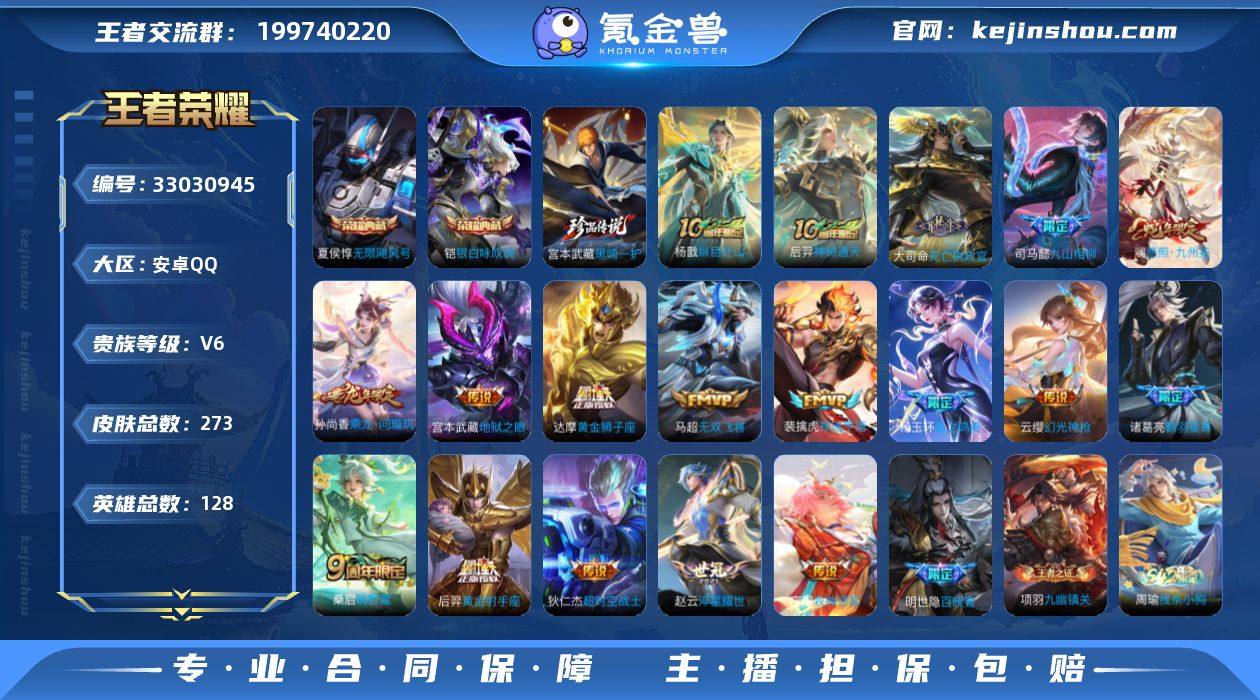 安卓Q-V6-永恒钻石II段位-128英雄-273皮肤-2典藏皮肤-1珍品传说-18传说-71史诗 【英雄全皮】:苍全皮,空空儿全皮 【荣耀典藏】:夏侯惇无限飓风号,铠银白咏叹调 【珍品传说】:宫本武藏黑崎一护 【传说皮肤】:杨戬纵目迁山,后羿神树通天,大司命死亡执政官,司马懿九山相柳,杨玉环星之鸣奏,澜愿照九州拓,云缨幻光神枪,裴擒虎祥瑞亨通,桑启鸣野蒿,庄周牧神诗旅,孙尚香乘龙问璇玑,诸葛亮鹤羽星尊,马超无双飞将,赵云淬星耀世,达摩黄金狮子座,后羿黄金射手座,宫本武藏地狱之眼,狄仁杰超时空战士 【限定皮肤】:大乔绒语心约,虞姬夏日便利店,姜子牙天穹之誓,狄仁杰阴阳师,赵云皇家上将,高渐离玩趣恶龙,扁鹊奇幻香踪,马可波罗暗影游猎,马可波罗山海玄木吟,狄仁杰魔术师,达摩沙漠行僧,项羽海滩派对,孙悟空至尊宝,李元芳云中旅人,杨玉环遇见飞天,鬼谷子五谷丰年,诸葛亮鹤羽星尊,百里玄策原初追逐者,沈梦溪大漠名商,裴擒虎擒涛扼浪,嫦娥暖冬兔眠,鲁班大师探海日志,桑启海盐诗旅,暃星界游侠,阿古朵江河有灵,张良古海寻踪,蒙恬荣光圣徽,鬼谷子天穹祈灯,姬小满妄想食味,孙尚香乘龙问璇玑,沈梦溪龙舞盛年,鲁班七号蔬乡物语,李元芳蔬乡物...