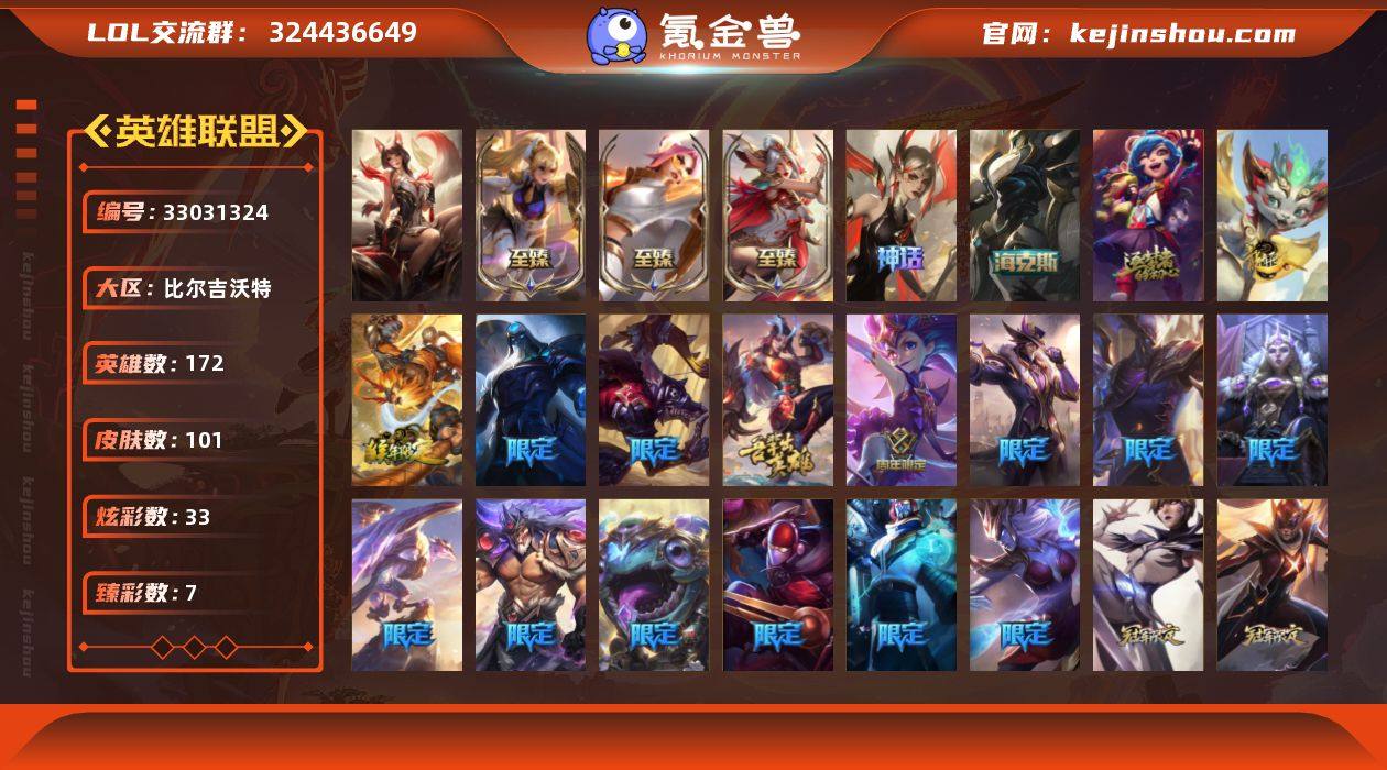 【Hyx284】大区:比尔吉沃特-铂金段位-172英雄-101皮肤-33炫彩-0终极-7神话-25限定-16传说-13史诗、殿堂传奇阿狸 【卓越皮肤】:殿堂传奇阿狸 【神话皮肤】:十周年纪念安妮,殿堂传奇乐芙兰,神凰行者瑞羽圣凰艾尼维亚 【至臻皮肤】:至臻战斗学院蕾欧娜,至臻福牛守护者菲奥娜,至臻神凰行者烈羽焰凰霞 【海克斯皮肤】:零之枪骑赫卡里姆 【臻彩皮肤】:无畏骑士瑟庄妮赤子初心,冠军之志瑞兹凯旋圣装,灵魂莲华亚索春晓,可爱可爱粉红红布里茨,殿堂传奇乐芙兰登神,西部魔影执行人卡特琳娜纯洁 【年限皮肤】:美猴王孙悟空,天龙之子斯莫德,龙马烈焰波比 【冰雪限定】:平安夜女神娑娜,魄罗骑士瑟庄妮 【限定皮肤】:冠军之志瑞兹,SKTT1劫,SKTT1瑞兹,SKTT1辛德拉,iG卡蜜尔,FPX薇恩,星之守护者佐伊,神凰行者幽羽玄凰萨勒芬妮,暗裔英雄盖伦,胜利之剑亚托克斯,胜利女神瑟庄妮,胜利凤凰艾尼维亚,胜利之王泰达米尔,胜利巨口克格莫,胜利之运崔斯特,泳池派对菲奥娜,泳池派对辛德拉,都铎王朝图奇,玉剑传说舞龙卫 【传说皮肤】:铁哥们儿奥拉夫,地狱之门卫士加里奥,幻灵战斗队长厄运小姐,源计划联合艾希,鬼魂新娘莫甘娜,战地巨兽科加斯,律政大亨蒙多,战...