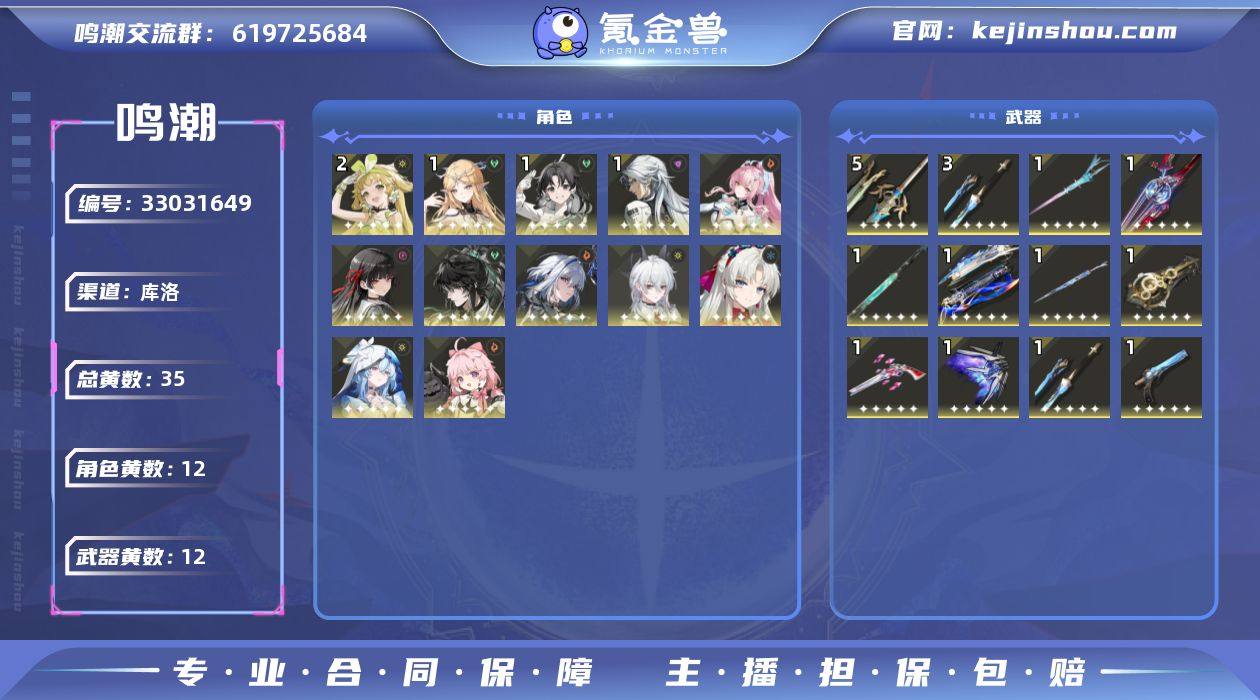 男/女主: 女主 总黄数: 35 联觉等级: 80 拥有五星共鸣者: 鉴心,卡卡罗,安可,维里奈,守岸人,珂莱塔,赞妮,卡提希娅,嘉贝莉娜,仇远,千咲,爱弥斯 2鸣五星共鸣者: 2鸣维里奈 1鸣五星共鸣者: 1鸣鉴心,1鸣卡卡罗,1鸣卡提希娅 0鸣五星共鸣者: 0鸣安可,0鸣守岸人,0鸣珂莱塔,0鸣赞妮,0鸣嘉贝莉娜,0鸣仇远,0鸣千咲,0鸣爱弥斯 拥有五星武器: 千古洑流,停驻之烟,星序协响,死与舞,血誓盟约,焰光裁定,不屈命定之冠,光影双生,裁竹,昙切,永远的启明星 5鸣五星武器: 5鸣血誓盟约 3鸣五星武器: 3鸣千古洑流 1鸣五星武器: 1鸣千古洑流,1鸣停驻之烟,1鸣星序协响,1鸣死与舞,1鸣焰光裁定,1鸣不屈命定之冠,1鸣光影双生,1鸣裁竹,1鸣昙切,1鸣永远的启明星 亮点: 【MC219】80级/35黄/女主/12个五星角色/12个五星武器未绑定,爱弥斯,千咲,嘉贝莉娜,仇远,卡提希娅,赞妮,珂莱塔,守岸人,维里奈,鉴心,卡卡罗,安可,永远的启明星,昙切,裁竹,光影双生,不屈命定之冠,焰光裁定,血誓盟约,死与舞,星序协响,千古洑流,停驻之烟,2命维里奈,1命卡提希娅,1命鉴心,1命卡卡罗,0命爱弥斯,0命千咲,0命嘉贝莉娜,0命仇远,0命赞妮,0命珂莱塔,0命守岸人,0命安可,精5血誓盟约,精3千古洑流,精1永远的启明星,精1昙切,精1裁竹,精1光影双...