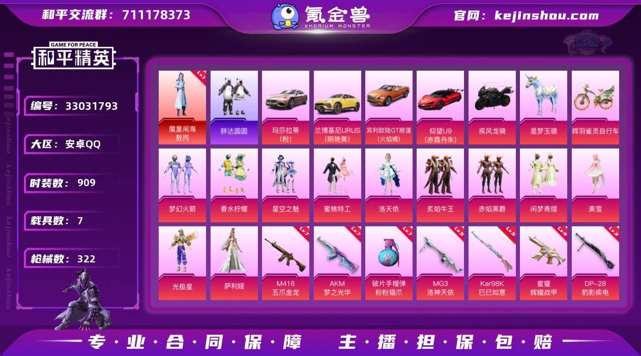 敖丙!多载具账号!11.3万热力值!粉玛莎!火箭!星梦玉骢!满级破片手榴弹粉粉猫爪!D11201.安卓QQ.243套装1红装11粉装7载具295枪皮10粉枪19飞行器.香水柠檬.沙丘之主天马(2级).354扭蛋碎片. 【稀有资产】角色-魔童闹海-敖丙[1级]/套装-梦幻火箭/M416-五爪金龙[7级]/M416-墨龙九天[3级]/角色-8号机/角色-Mark.06/熔岩游骑兵面罩/小恶魔头饰/套装-胖达圆圆/套装-浪漫天命/套装-雪山精英/套装-龟仙人/套装-暗夜之虎/套装-花面小丑/角色-情公主/套装-金羽特工/角色-忠义严颜/角色-忠猛周仓/角色-忠真马岱/套装-SS1特训/熔岩游骑兵连帽夹克/套装-拳皇97八神庵/角色-迪迦奥特曼 【粉色套装】套装-星空之魅/套装-香水柠檬/套装-蜜桃特工/角色-洛天依/套装-赤焰黑爵/套装-炙焰牛王/套装-闲梦青缨/角色-光极星/角色-美雪/角色-萨利娅 【粉色枪皮】AKM-梦之光华[7级]/破片手榴弹-粉粉猫爪[7级]/Kar98K-巳巳如意[5级]/MG3-洛神天依[5级]/蜜獾-辉耀战甲[4级]/P90-沙丘之主[3级]/DP-28-豹影疾电[3级]/PKM-江南烟雨[2级] 【载具】仰望U9(赤霞丹朱)/辉羽雀灵自行车/疾风龙骑/兰博基尼URUS(明艳黄)/玛莎拉蒂Ghibli(粉)/宾利欧陆GT敞篷(火焰橘)/星梦玉骢 【飞行器】萌酷奶龙飞行器/灵珠游...