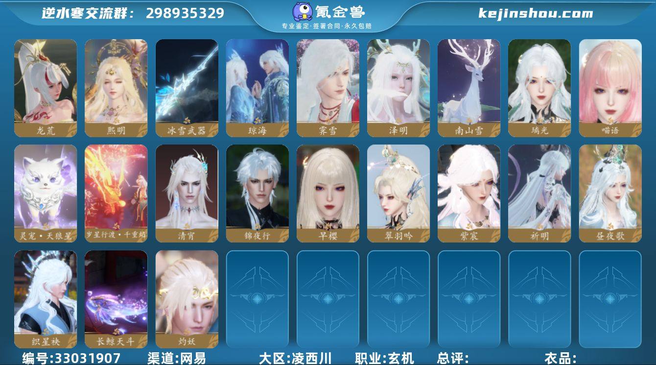 【24已用1转盘1未用】战力值:220415 总评:220415 角色等级:89 衣品值: 249780 国色值: 49600 已用天赏石:24 【网易手机账号】 【无换绑冷却】 【玄机】 【女】 【6级】 【把酒临风】 【互通】 转盘外观1 天赏外观19 天赏祥瑞1 天赏灵宠1 武器环身4 转盘外观:灼妖; 天赏外观:早樱,锦夜行,祈明,清宵,龙荒,喵语,熙明,璃光,泽明,霁雪,昼夜歌,琼海,织星袂,翠羽吟,紫宸,冰雪武器,星辰武器,蝴蝶武器,明河曙天·长鲸天斗; 天赏祥瑞:南山雪; 天赏灵宠:灵宠·天狼星; 武器环身:掌星执辰,振金雷,天魔蛊主,渊墟深影;