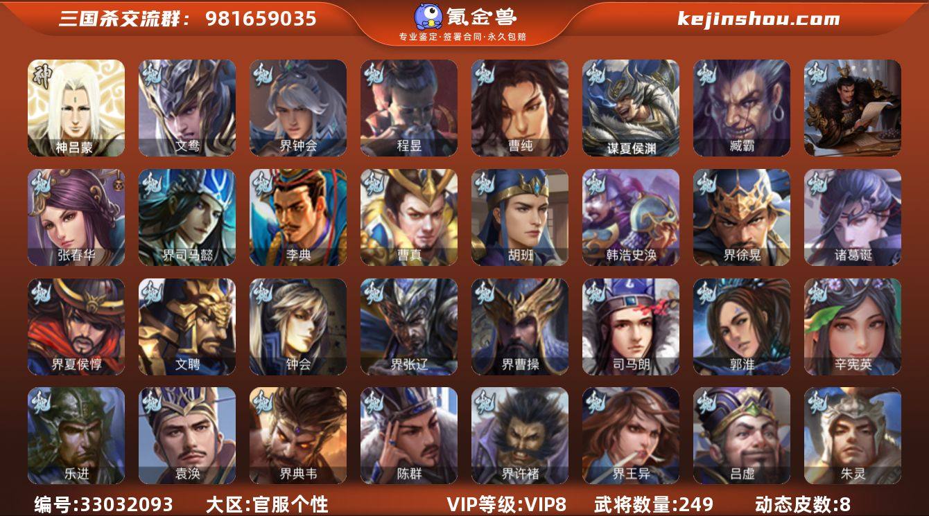 【14789946】官阶:骠骑将军;VIP等级:VIP8;史诗武将数量:17;动态皮肤数量:8;武将总数:249;史诗宝珠数量:0;将魂数量:628;神将:0;魏国史诗武将:4;蜀国史诗武将:5;吴国史诗武将:4;群史诗武将:6
