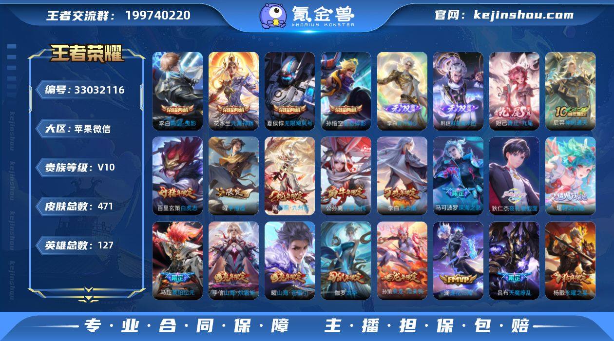 【背包一颗水晶,4典藏,3无双,57传说】实名: 可修改 性别: 女号 贵族等级: V10 英雄数: 127 皮肤数: 471 荣耀水晶: 无限飓风号,鸣剑·曳影,全息碎影,九霄神辉 无双皮: 青丘·九尾,碎月剑心,韩信群星魔术团 传说皮: 黄金狮子座,黄金射手座,冠军飞将,云鹰飞将,猫影幻舞,久胜战神,炽阳神光,一念神魔,末日机甲-孙尚香,地狱火,仲夏夜之梦,飞鸢探春,李逍遥,时之恋人-刘备,游龙清影,淬星耀世,超时空战士-狄仁杰,无双飞将,山海·炽霜斩,山海·琳琅生,山海·苍雷引,画中仙,浮生妄,鹤羽星尊,灼幽烈阳,妄想实况,遇见神鼓,永恒水手月亮,夜礼服假面,澜逐花归海,艾琳觅芳踪,琥珀纪元马超,乘龙·问璇玑,乘龙·铭钟鼎,乘龙·淬吴钩,黄金天蝎座,幻光神枪,神树通天 限定皮: 冰锋战神,遇见飞天,李小龙,奔雷神使,祈雪灵祝,梁祝,御风骁将,时雨天司,引擎之心,龙胆,白鹤梁神女,武圣,魔法小厨娘,辉光之辰,天狼溯光者,天魔缭乱,神威,蜜橘之夏,永曜之星,幽恒,时之彼端,飞衡,乒乒小将,太华,天狼征服者,天狼狩猎者,冰霜恋舞曲,天狼运算者,逐梦之星,逐梦之影,逐梦之光,天狼绘梦者,凤求凰,美猴王,白虎志,青龙志,朱雀志,凤凰于飞,武陵仙君,如梦令-后羿,大圣娶亲,霸王别姬-项羽,霸王别姬-虞姬,高山流水,孙行者,猪悟能...