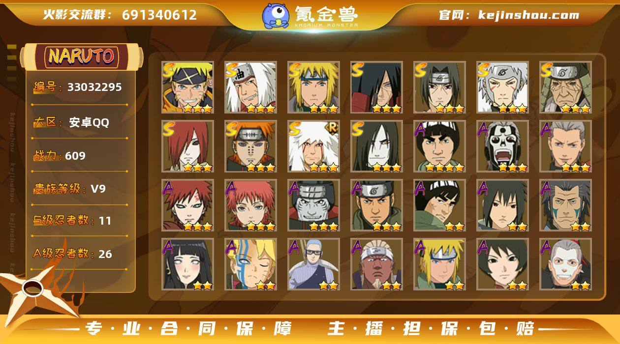 【火影忍者连体王者荣耀】实名: 可修改 贵族等级: V9 S忍数: 11 A忍数: 26 战力值(万): 609 S级忍者: 宇智波斑「秽土转生」,猿飞日斩「秽土转生」,长门「秽土转生」,千手扉间,佩恩「天道」,大蛇丸,波风水门,宇智波鼬 「须佐能乎」
