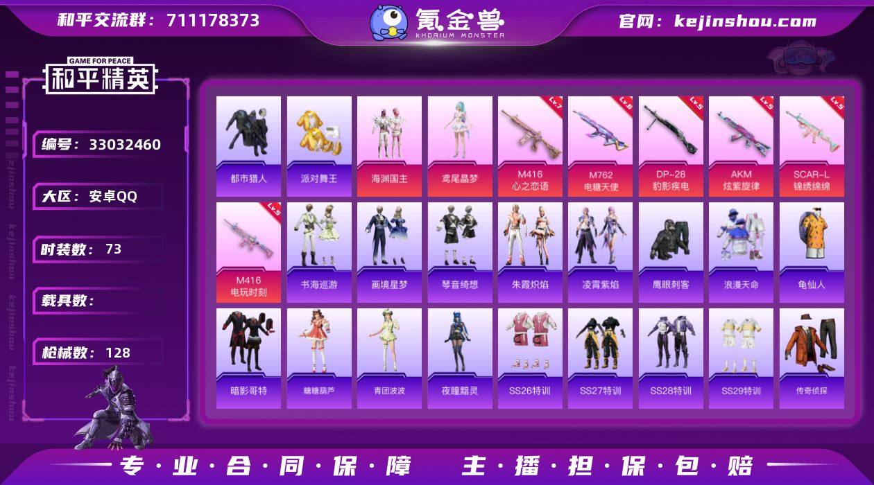 安卓 【素材号 套装-暗影哥特/套装-浪漫天命/套装-都市猎人/套装-派对舞王/SCAR-L-锦绣绵绵(五级)/M416-心之恋语(七级)/M416-电玩时刻(五级)】手Q-2粉装-8特效枪-0载具-3粉色飞行器-39415热力值-5王牌印记-73套装-128枪皮 【热门品类】:套装-浪漫天命,套装-都市猎人,套装-派对舞王,套装-龟仙人,套装-暗影哥特 【粉色套装】:粉装-海渊国主,角色-鸢尾晶梦 【粉色枪皮等级】:AKM-炫紫旋律(五级),SCAR-L-锦绣绵绵(五级),M416-心之恋语(七级),M416-电玩时刻(五级),M762-电糖天使(六级),Mk14-福马献瑞(五级),AA12-G-萌骑幻想(四级),DP-28-豹影疾电(五级) 【粉色枪皮】:AKM-炫紫旋律,SCAR-L-锦绣绵绵,M416-心之恋语,M416-电玩时刻,M762-电糖天使,Mk14-福马献瑞,AA12-G-萌骑幻想,DP-28-豹影疾电 【粉色飞行器】:炫彩糖果飞行器,星夜魔法师飞行翼,极意拳锋飞行器 【粉色降落伞】:海渊国主降落伞,恐龙拽拽降落伞,鸢尾晶梦降落伞,异瞳寒姬降落伞,极意拳锋降落伞,炫彩糖果降落伞 【稀有套装】:套装-龟仙人,套装-炫彩糖果,套装-马上有钱,套装-迅捷龙虾,套装-糖糖葫芦,套装-青团波波,角色-夜瞳黯灵,套装-朱霞炽焰,套装-凌霄紫焰,套装-书海巡游,...