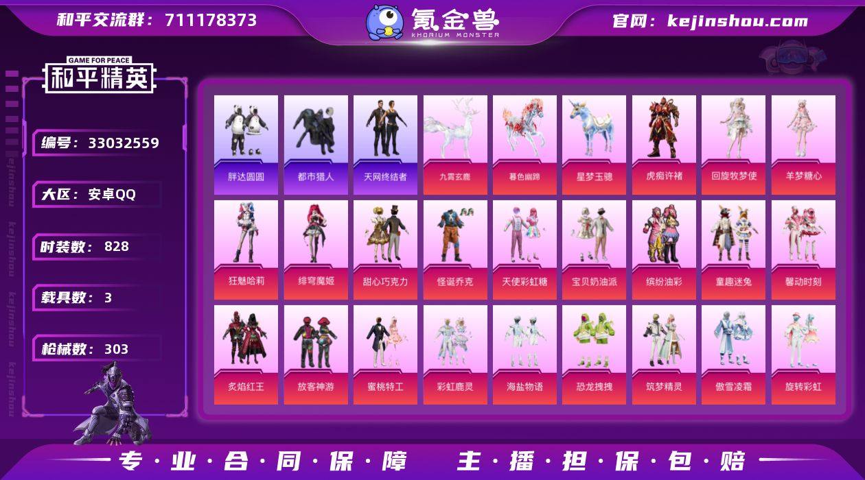 【主播推荐】实名: 可修改 时装数: 828 载具数: 3 枪械数: 303 战备数: 210 热门装扮: 甜心巧克力,怪诞乔克,宝贝奶油派,天使彩虹糖,放客神游,鹰眼刺客,缤纷油彩,都市猎人,炙焰红王,童趣迷兔,馨动时刻,蜜桃特工,彩虹鹿灵,海盐物语,恐龙拽拽,筑梦精灵,傲雪凌霜,旋转彩虹,冰川粉黛,冰川红玫,冰川幽秘,恶魔喵喵,激萌罗小黑,胖达圆圆,兔兔白日梦,第五大道,呆萌星弥,暗夜魅影,狂魅哈莉,绯穹魔姬,羊梦糖心,回旋牧梦使,虎痴许褚 载具: 星梦玉骢,暮色幽蹄,九霄玄鹿 稀有枪皮: AKM炫紫旋律,AKM甜心宝贝,M416心之恋语,SLR暗夜玫瑰,P90沙丘之主,AUG星梦奇缘,GROZA-精灵之光,Famas-翎光蝶翼,AKS-74U-无垠阁,DP-28-豹影疾电,AKS-74U-森灵之息,燃烧瓶-天降桃花,破片手榴弹-招财进宝,MG3-萌骑闯关,AA12-G-萌骑幻想,ACE32-萌骑漫游,PKM-萌骑夺宝,烟雾弹-好运连连,M416-天马神君,SCAR-L-灵驹仙姬,ARX-萌骑跃动,UMP45-萌骑冒险,MP7-G-水中影,AUG-花中眠,Vector-月中灵