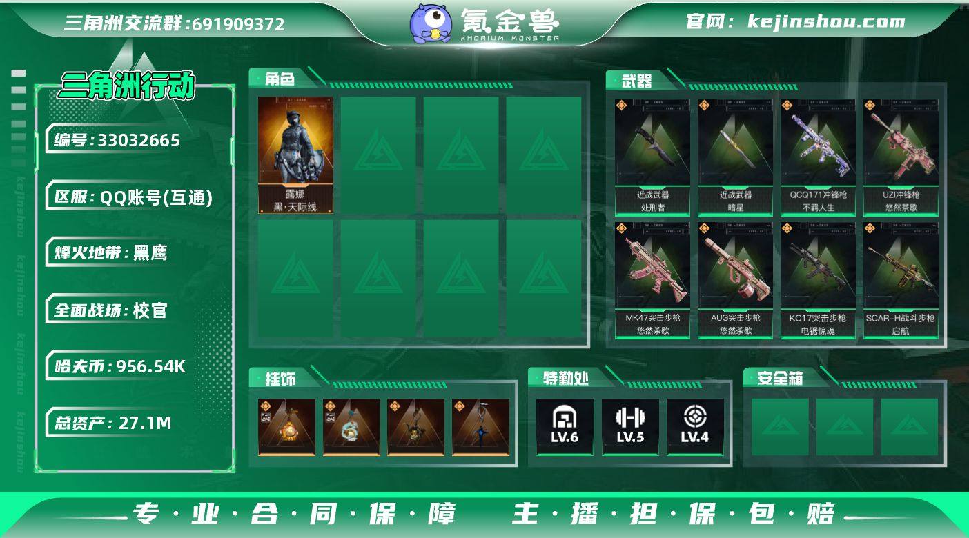 总资产:27.15M,哈夫币:95W,传说武器29,史诗武器29,武器皮肤153;烽火60级:黑鹰Ⅴ,战场:校官Ⅳ,【安全箱】进阶安全箱;【特勤处等级】仓库LV.6,靶场LV.4,训练中心LV.5,收藏室LV.0,潜水中心LV.1;【捆绑包7】黑天际线捆绑包,锦绣捆绑包,悠然茶歇捆绑包,特斯拉线圈捆绑包,捞点薯条捆绑包,夜莺捆绑包,缄花捆绑包;【干员皮肤1】露娜黑天际线;【近战皮肤3】近战武器-处刑者,近战武器-暗星,近战武器-黑鹰