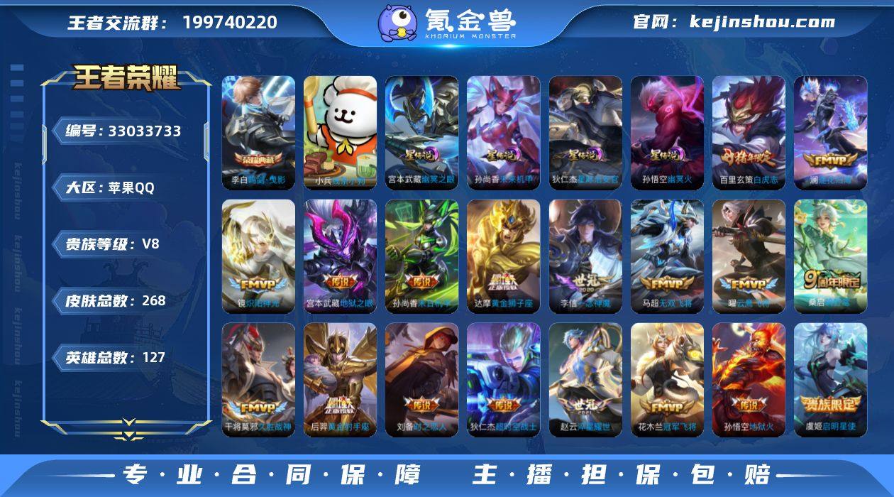 V8 1小国标 1典藏 19传说 4星元 268皮肤 127英雄 【1水晶】李白-鸣剑·曳影【19传说】马超-无双飞将,百里玄策-白虎志,达摩-黄金狮子座,狄仁杰-超时空战士,干将莫邪-久胜战神,宫本武藏-地狱之眼,后羿-黄金射手座,花木兰-冠军飞将,镜-炽阳神光,铠-绛天战甲,李信-一念神魔,刘备-时之恋人,孙尚香-末日机甲,孙悟空-地狱火,虞姬-启明星使,赵云-淬星耀世,澜-逐花归海,曜-云鹰飞将,桑启-鸣野蒿【4星元】狄仁杰-星际治安官,孙尚香-未来机甲,孙悟空-幽冥火,宫本武藏-幽冥之眼,线条小狗小兵【75史诗】元歌-无心,赵云-未来纪元,金蝉-唐三藏,狂铁-电玩高手,夏洛特-永昼,阿轲-暗夜猫娘,阿轲-节奏热浪,阿轲-迷踪丽影,安琪拉-心灵骇客,安琪拉-时之奇旅,白起-星夜王子,百里守约-特工魅影,百里守约-朱雀志,百里玄策-原初追逐者,不知火舞-魅语,曹操-幽灵船长,嫦娥-拒霜思,程咬金-功夫厨神,狄仁杰-魔术师,狄仁杰-鹰眼统帅,貂蝉-圣诞恋歌,干将莫邪-真爱魔法,宫本武藏-鬼剑武藏,花木兰-水晶猎龙者,花木兰-默契交锋,橘右京-修罗,铠-曙光守护者,兰陵王-暗隐猎兽者,老夫子-圣诞老人,李白-千年之狐,李元芳-逐浪之夏,廉颇-地狱岩魂,刘邦-德古拉伯爵,刘禅-天才门将,露娜-紫霞仙子,鲁班七号-电玩小子,吕布-圣...
