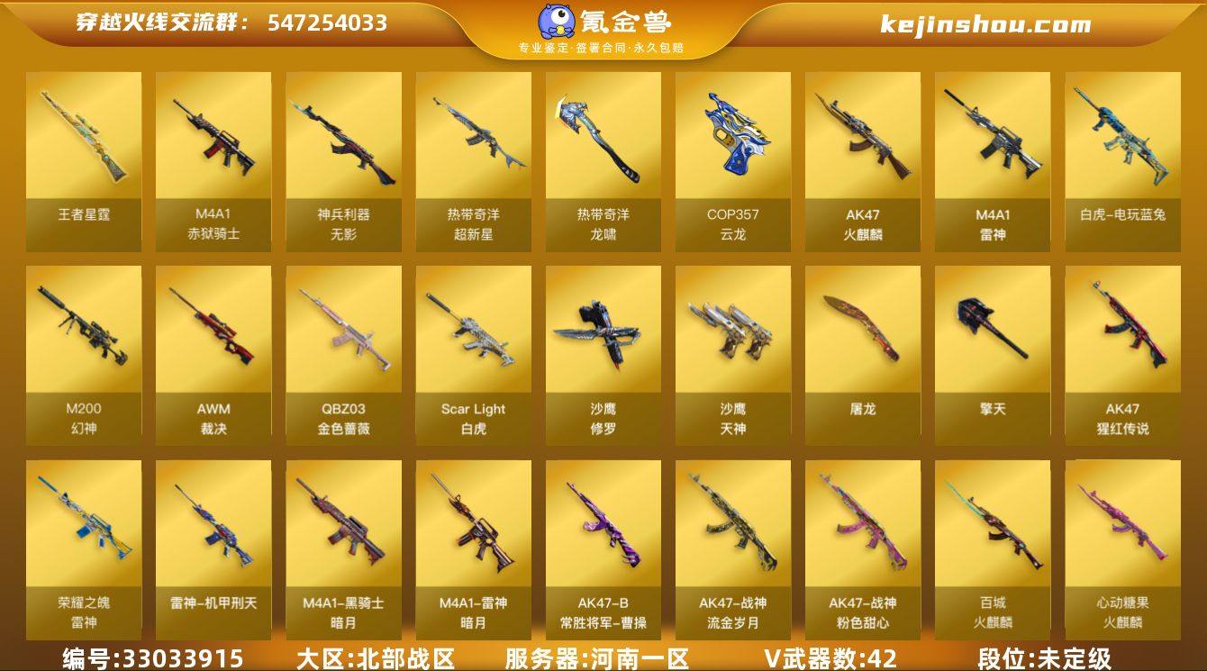 河南一区-41V-1王者武器数-0炫金武器数 【传说角色】:传说影煞 【热门武器】:QBZ03-金色蔷薇,Scar Light-白虎,M200-幻神,白虎-电玩蓝兔,沙鹰-修罗 【王者炫金武器】:王者星霆 【音效卡】:M200-幻神音效卡,Barrett-碧霄极光音效卡 【皮肤】:幻神-宠儿-2021MVP,雷神-暗月,雷神-荣耀之魄,雷神-机甲刑天皮肤,雷神-宇航兔皮肤,火麒麟-平天大圣,火麒麟-百城,火麒麟-心动糖果,黑骑士-暗月*2,战神-粉色甜心皮肤,战神-流金岁月皮肤,AK47-B-常胜将军-曹操,屠龙-星火燎原 【角色】:零·纪元,战地猎狐,奇洋探员,乔伊教练,云海玲珑,暗夜-X,初恋灵狐,芳心审判者,嘉年华灵狐,猎狐者-追月,灵狐者-X,灵狐者-七夕宝贝,麻雀,曼陀罗-X,曼陀罗-礼服,潘多拉-X,潘多拉-甜心教官,斯沃特-X,蜀雪,兔囡囡,樱-战斗天使 【人偶武器】:M4A1-雷神-精英刀锋,AWM-灵狐-15周年嘉年华,迷你艾比,迷你超能女侍 【暴走生化】:超级对讲机 【挑战大师】:冰龙粉碎者-白马银枪,激光毁灭者III-白马银枪 【英雄级武器】:AK47-火麒麟,M4A1-雷神,Scar Light-白虎,无影-神兵利器,超新星-热带奇洋,QBZ03-金色蔷薇,AK-47-猩红传说*3,白虎-电玩蓝兔,AWM-裁决,M200-幻...