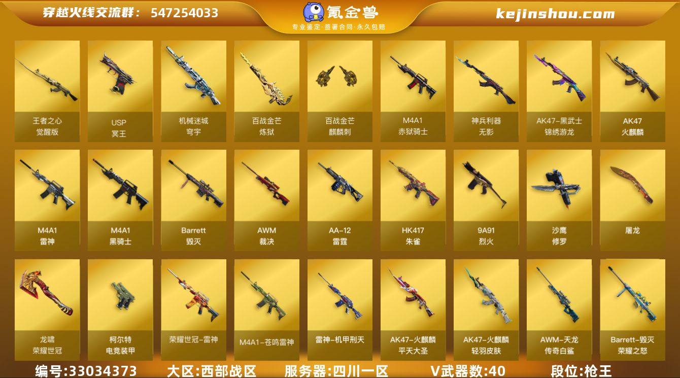 【ky6673】四川一区-45V-1王者武器数-0炫金武器数 【传说角色】:传说星骇 【热门武器】:HK417-朱雀,荣耀世冠-雷神,QBZ03-街机,M4A1-黑骑士,沙鹰-修罗*2,荣耀世冠-龙啸 【音效卡】:屠龙-电竞之星-竞星跃动音效卡,AK47-火麒麟音效卡,M4A1-黑骑士音效卡,Barrett-毁灭音效卡,HK417-朱雀-电竞之星-竞星跃动音效卡,沙鹰-修罗-盛典舞曲音效卡*2,炼狱-百战金芒-庆典舞曲音效卡 【皮肤】:白虎-白鲨-CFPLS23冠军,金色蔷薇-电竞之星 皮肤,裁决-叶芒苍灵 皮肤,雷神-荣耀之魄,雷神-机甲刑天皮肤,M4A1-再燃火线,火麒麟-轻羽皮肤,火麒麟-平天大圣,AK47-火麒麟-百城23冠军皮肤,毁灭-荣耀之怒,毁灭-英雄计划 皮肤,无影-华夏传说 皮肤,AWM-天龙-传奇白鲨,修罗-叶芒苍灵 皮肤,屠龙-荣耀之锋,屠龙-荣耀世冠AG*2,龙啸-巅峰荣耀 皮肤,轻型军用手斧-再燃火线 【角色】:零·纪元,战地猎狐,奇洋探员,乔伊教练,云海玲珑,葵-阿尔法武装,幻面灵狐,斗烈龙骑,暗夜-X,芳心审判者,飞虎队-X,娟娟,灵狐者-X,龙儿,龙儿-小淘气,曼陀罗-X,娜塔莉娅,潘多拉-甜心教官,蜀雪,维纳斯,夜玫瑰-宠粉,樱-青春偶像,影武者-X,游珑儿,智影,潘多拉-N 【人偶武器】:迷...