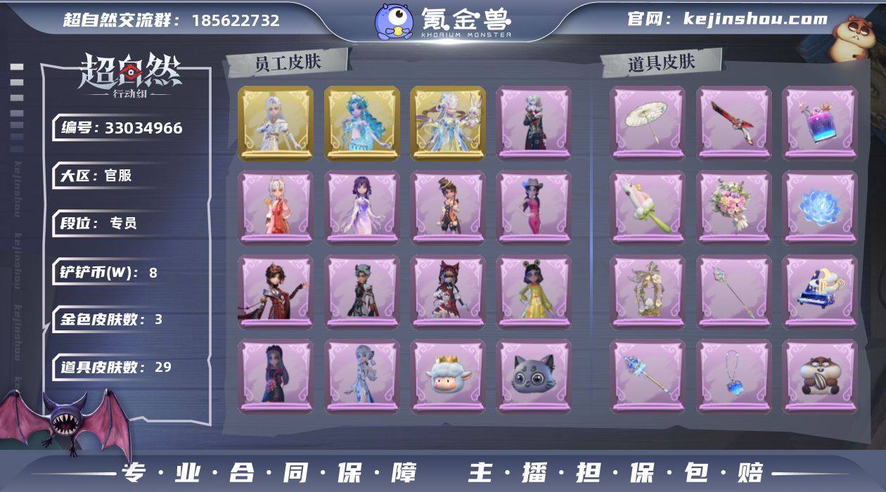 金色皮肤数量: 3 紫色皮肤数量: 11 道具皮肤数量: 29 段位: 专员 员工: 逍遥,薇薇安,巫铃儿,莉莉,阿念,艾伦,小黄,零,爱丽丝,爱德华,兰,小满,临云 外观: 丝缕哀歌,素影瑶光,嘻嘻头套,烈焰红唇头套,呆滞头套,卑微头套,哈士奇头套,滑稽头套,鱼头怪头套,面具马头套,萨卡班甲鱼头套,呱呱雨衣,火爆了头套,精致露比头套,惊魂南瓜,莓果陷阱,樱桃奶油布丁,仙锋小姐,雪墩墩头套,太空鲨头套,尘封旧事,黎明猎手,耀眼的你,庆宴绮愿,晚安小熊,烛光纪念,小快头套,瑶台梦,不朽的今夜,牛啤背包,海月息潮,剑仙,琢玉怀乡,织锦云程,饺饺者头套,夜浮船,孤独对望,桂冠聆诗,侧耳倾听,园丁鲨鲨头套,马上好运,梵卓之礼,蛋黄啵啵,煤球喵,小羊的王子梦