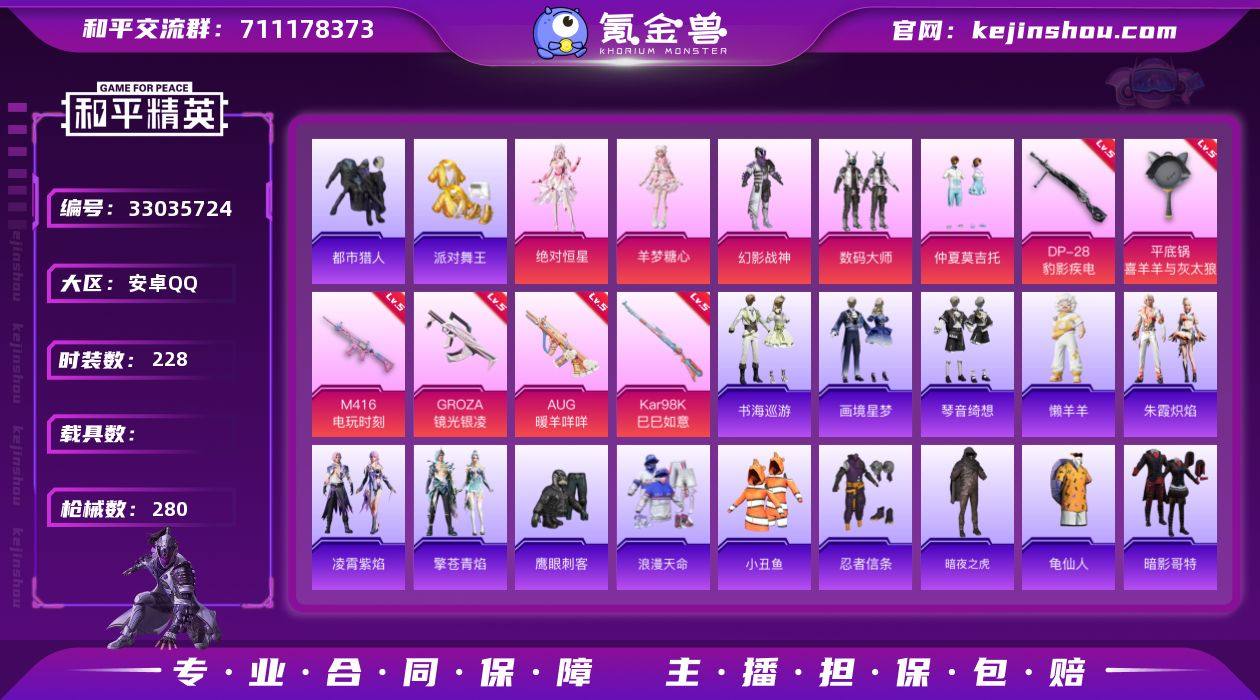 安卓 手Q-5粉装-8特效枪-0载具-1粉色飞行器-82667热力值-21王牌印记-228套装-280枪皮 【热门品类】:套装-浪漫天命,套装-都市猎人,套装-派对舞王,套装-小丑鱼,套装-忍者信条,套装-暗夜之虎,套装-龟仙人,套装-暗影哥特 【粉色套装】:角色-绝对恒星,粉装-幻影战神,粉装-数码大师,粉装-仲夏莫吉托,角色-羊梦糖心 【粉色枪皮等级】:M416-电玩时刻(五级),GROZA-镜光银凌(五级),AUG-暖羊咩咩(五级),AKS-74U-森灵之息(五级),Kar98K-巳巳如意(五级),Mk14-福马献瑞(五级),DP-28-豹影疾电(五级),平底锅-喜羊羊与灰太狼(七级) 【粉色枪皮】:M416-电玩时刻,GROZA-镜光银凌,AUG-暖羊咩咩,AKS-74U-森灵之息,Kar98K-巳巳如意,Mk14-福马献瑞,DP-28-豹影疾电,平底锅-喜羊羊与灰太狼 【粉色飞行器】:炫彩糖果飞行器 【粉色降落伞】:绝对恒星降落伞,极限特训降落伞,幻影战神降落伞,花间之火降落伞,暗夜鎏金降落伞,仲夏莫吉托降落伞,临安公主降落伞,炫彩糖果降落伞 【稀有套装】:套装-龟仙人,玩偶服-憨乐熊二,套装-巳巳如意,套装-雪国风尚,套装-炫彩糖果,套装-马上有钱,套装-迅捷龙虾,角色-米开朗基罗,角色-怀庆长公主,套装-燕燕于飞,套装-鱼渊荷...