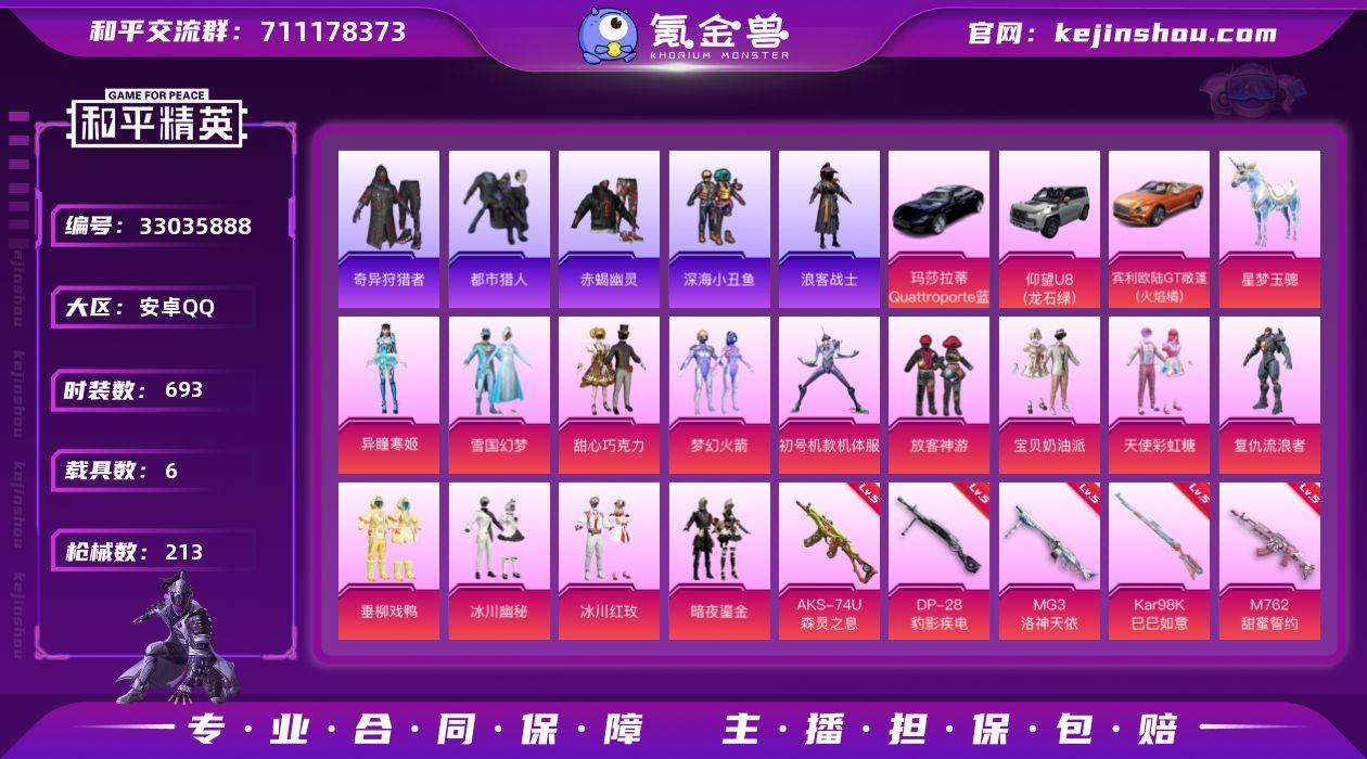 【特价出售】安卓Q-4稀有4载具13粉装14特效枪24热门179套装213枪皮 86323热力值 10印记 历史超级王牌13星 【4稀有】 奇异狩猎者 赤蝎幽灵 都市猎人 浪漫天命 【4载具】 仰望U8(龙石绿) 宾利欧陆GT火焰橘 玛莎拉蒂Q蓝色 星梦玉骢 【13粉装】 紫螳螂 梦幻火箭 雪国幻梦 宝贝奶油派 天使彩虹糖 甜心巧克力 异瞳寒姬 垂柳戏鸭 放客神游 冰川幽秘 暗夜鎏金 冰川红玫 复仇流浪者 【14特效枪】 SCAR-L-梦幻火箭 (4级) AKM-甜心宝贝 (5级) AKS-74U-森灵之息 (5级) Kar98K-巳巳如意 (5级) M762-甜蜜誓约 (5级) DP-28-豹影疾电 (5级) AUG-星梦奇缘 (5级) Kar98K-创世救赎 (1级) M416-风花雪月 (5级) MG3-洛神天依 (5级) AKS-74U-森灵之息 (5级) Mk14-福马献瑞 (5级) UMP45-萌骑冒险 (1级) Vector-环太平洋 (2级) 【24热门】 小丑鱼 龟仙人 潮萌小黄鸭 呆萌铁蟹 鹰眼刺客 兔兔白日梦 银碳小老虎 暗夜行者 迅捷狂鲨 深海小丑鱼 浪客战士 暗夜契约 暗影哥特 团圆交子 瑞龙福将 纯白誓言 豚鼠丹丹 狂沙舞者 漫步者 破蛋小黄鸡 极速红龙 军刀雅典娜 英勇保护者 M762-瑞龙福将 【2飞行器】 梦幻火箭飞行器 千面幻镜飞行器 【8头盔】 国宝胖达头盔 梦幻火箭头盔 雪国精灵头盔 甜心宝贝头盔 百万...