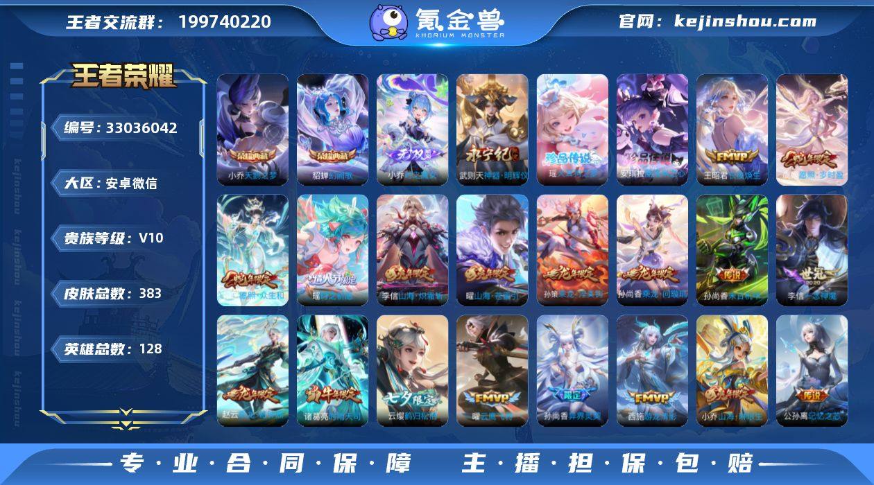 安卓WX-V10-至尊星耀II段位-128英雄-383皮肤-2典藏皮肤-1典藏英雄-2无双-2珍品传说-44传说-110史诗