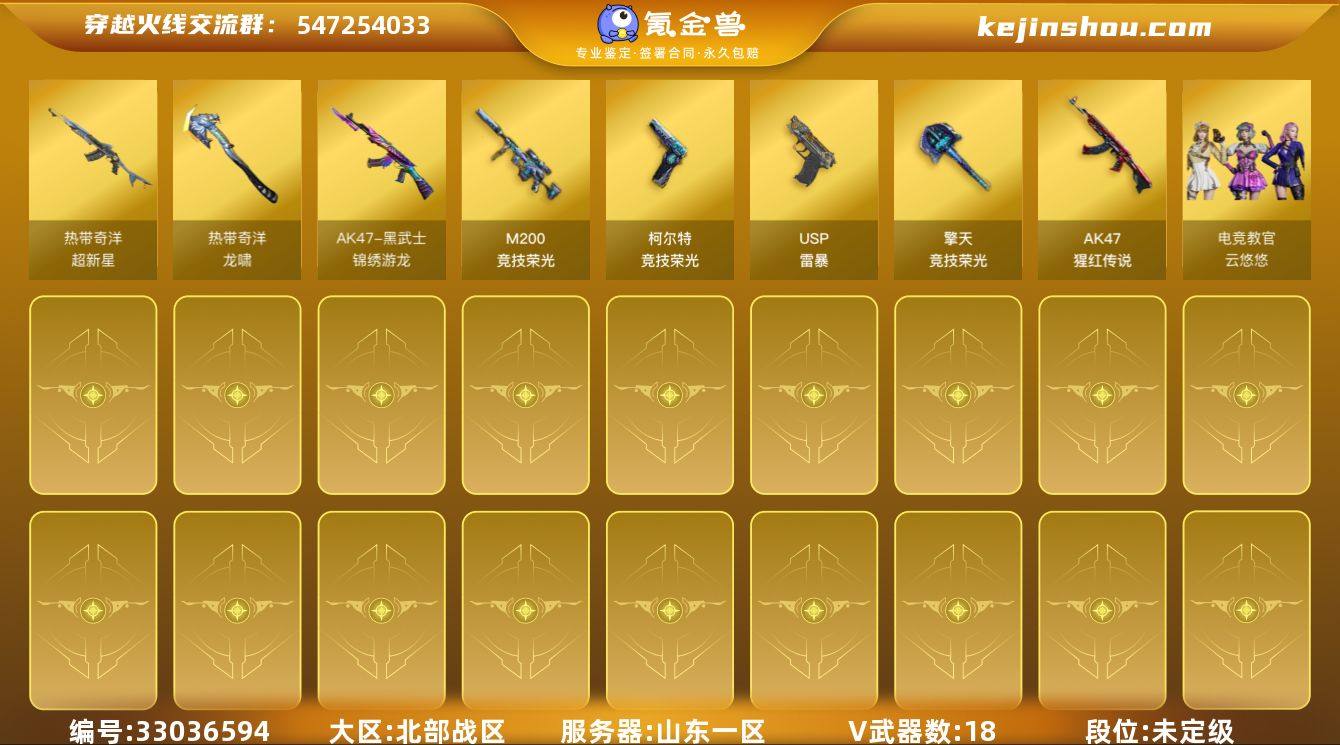 山东一区-17V-1王者武器数-0炫金武器数 【热门武器】:M200-竞技荣光,USP-雷暴 【王者炫金武器】:王者冰锋 【角色】:电竞教官-云悠悠,战地猎狐,奇洋探员,乔伊教练,斗烈龙骑,初恋灵狐 【人偶武器】:生化手雷-机甲核心*2 【英雄级武器】:黑武士-锦绣游龙,超新星-热带奇洋,AK-47-猩红传说,机械迷城-穹宇,天罚-斗烈龙驹,M200-竞技荣光,USP-雷暴,柯尔特-竞技荣光,擎天-竞技荣光,龙啸-热带奇洋,王者冰锋-觉醒版,屠龙-斗烈龙驹,高爆手雷-竞技荣光*3,手雷-热带奇洋,闪光弹-竞技荣光,烟雾弹-竞技荣光,M4A1-苍鸣雷神 【其他武器】:源·火麒麟*2,源-黑龙,御·黑龙-龙太子,源·雷神*3,魂·雷神-神秘按键,御·雷神-机甲刑天*2,御·雷神-烈虎,雷神-赛博幻想,魂·黑骑士-现代金属,魂·黑骑士-娜塔莉娅,灵·黑骑士-破界 I,源·武圣,源·机械迷城,魂·龙血-锋芒破茧,源·青龙,源·HK417-朱雀,源-金色蔷薇*2,魂·QBZ03-金色蔷薇-萌杀,魂·9A91·烈火-电子连击,魂·英雄-湾区光枢,源·天龙,魂·裁决-新人王绿豆*2,魂·毁灭-神秘黑洞*3,魂·Barrett-朱雀-锦鲤,魂·修罗-神兵利器,魂·修罗-现代金属,灵·天神-穹宇,源·武圣glock,魂·屠龙-惊鸿,魂·擎天-破浪10年,魂·...
