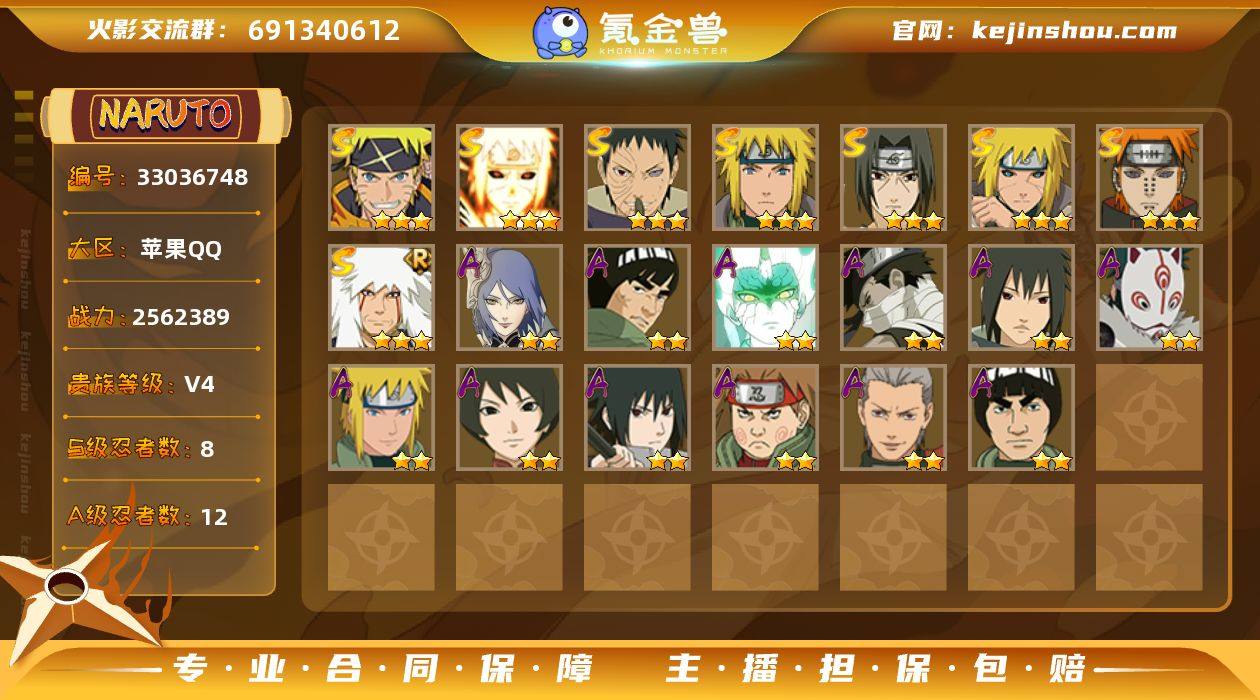 IOS/8S忍/12A忍/战力256W/V4/区服650 【S忍者】 宇智波佐助「漩涡鸣人」,宇智波带土「忍界大战」,自来也「舞之豪杰」,波风水门「秽土转生」,宇智波鼬「须佐能乎」,佩恩「天道」,波风水门,波风水门「九喇嘛连结」, 【A忍者】 小南「神驹佑将」,巳月「仙人模式」,迈特凯「青春爆炸」,宇智波泉奈,桃地再不斩「秽土转生」,神秘面具男「忍者之路」,波风水门「青年」,黑土「四代目土影」,宇智波佐助「须佐能乎」,秋道丁次「忍界大战」,飞段,迈特凯, PX_2543745