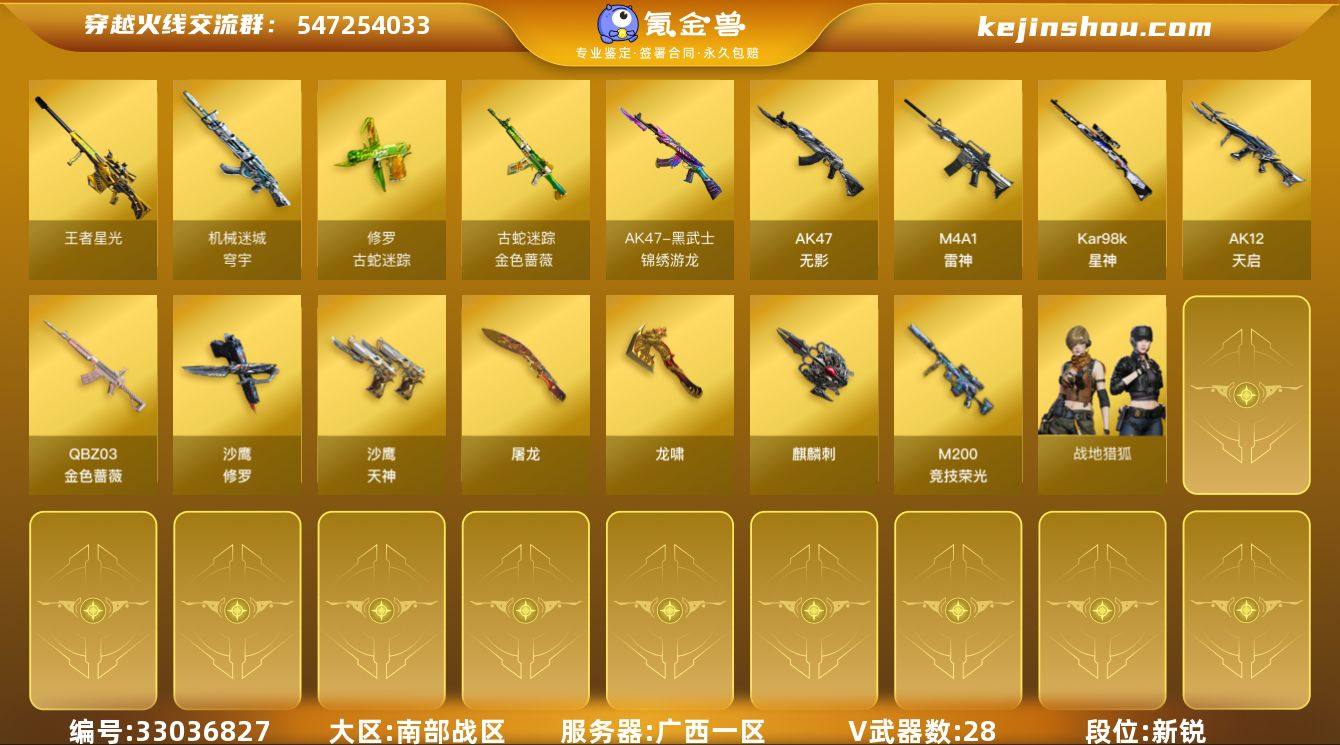 【ky6765】广西一区-32V-8王者武器数-0炫金武器数 【热门武器】:QBZ03-金色蔷薇,金色蔷薇-古蛇迷踪,修罗-古蛇迷踪,M200-竞技荣光,Kar98K-星神,沙鹰-修罗 【王者炫金武器】:王者星光,高爆手雷-雷霆王者*3 【皮肤】:雷神-化蛇 皮肤 【角色】:战地猎狐,蛇隐宗,炽天使,风暴女,娟娟,兰-新年限定,灵狐者-黄金海岸,曼陀罗-X,青霞仙子,蛇姬,铁骑荣耀,兔囡囡,铁扇公主-暗灵,维纳斯,影武者-X,游珑儿 【人偶武器】:星神-炽天使,迷你牛牛,迷你生化手雷,生化手雷-机甲核心,迷你艾比,QBZ03-斯沃特 【暴走生化】:超级对讲机 【英雄级武器】:M4A1-雷神,AK47-无影,AK12-天启,QBZ03-金色蔷薇,黑武士-锦绣游龙,金色蔷薇-古蛇迷踪,机械迷城-穹宇,Kar98K-星神,M200-竞技荣光,沙鹰-修罗,沙鹰-天神*3,修罗-古蛇迷踪,屠龙*4,龙啸,麒麟刺,高爆手雷-竞技荣光*3,高爆手雷-古蛇迷踪,高爆手雷-雷霆王者-觉醒版*3,闪光弹-竞技荣光*3,闪光弹-雷霆王者-觉醒版*4,烟雾弹-竞技荣光*2,烟雾弹-古蛇迷踪 【其他武器】:源·火麒麟,源·雷神*2,魂·M4A1-雷神-化蛇,魂·雷神-诺拉,御·雷神-烈虎,魂·黑骑士-幻能朋克,魂·黑骑士-破浪10年,御·黑骑士·哪吒闹海*2...