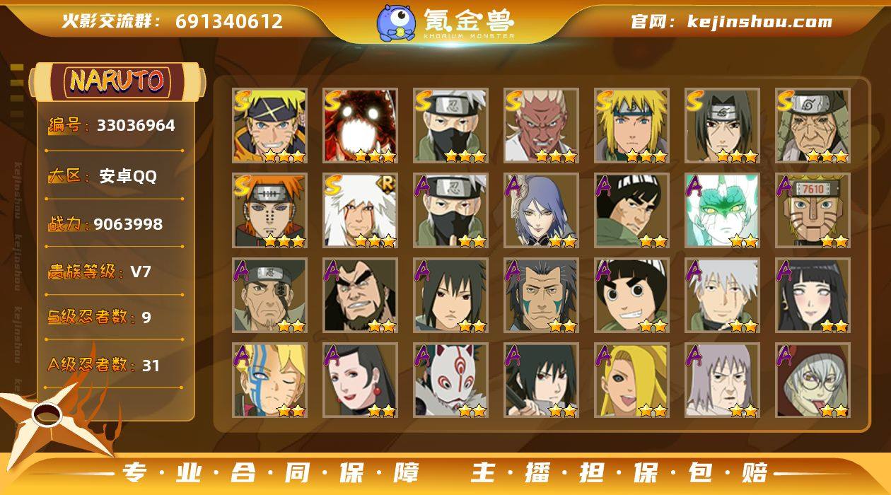 9S忍/31A忍/战力906W/V7/区服3804 【S忍者】 宇智波佐助「漩涡鸣人」,艾「忍界大战」,自来也「舞之豪杰」,旗木卡卡西「须佐能乎」,漩涡鸣人「暴怒·第六尾」,猿飞日斩「秽土转生」,宇智波鼬「须佐能乎」,佩恩「天道」,波风水门, 【A忍者】 小南「神驹佑将」,旗木卡卡西「神威对决」,机械鸣人「初始形态」,巳月「仙人模式」,迈特凯「青春爆炸」,土台「忍界大战」,不缘,漩涡博人「桃式显现」,日向雏田「最终章」,旗木卡卡西「幻之真容」,李洛克「忍界大战」,不动,宇智波泉奈,神农「羁绊」,神秘面具男「忍者之路」,宇智波佐助「须佐能乎」,迪达拉「秽土转生」,千代「近松十人卫」,药师兜「半蛇斗篷」,秋道丁次「忍界大战」,春野樱「百豪」,飞段「死司凭血」,飞段,迪达拉,我爱罗「疾风传」,蝎,干柿鬼鲛,宇智波鼬,猿飞阿斯玛,迈特凯,桃地再不斩, PX_2542763