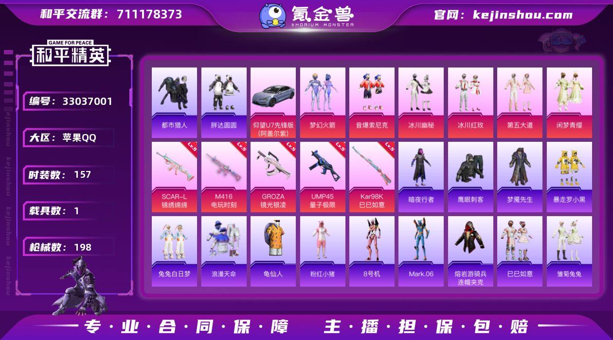 苹果 手Q-8粉装-8特效枪-1载具-3粉色飞行器-61381热力值-9王牌印记-157套装-198枪皮 【热门品类】:粉装-梦幻火箭,粉装-音爆索尼克,套装-浪漫天命,套装-都市猎人,套装-胖达圆圆,套装-暗夜行者,套装-龟仙人,套装-粉红小猪,角色-8号机,角色-Mark.06,熔岩游骑兵连帽夹克 【粉色套装】:粉装-梦幻火箭,粉装-冰川幽秘,粉装-冰川红玫,粉装-音爆索尼克,粉装-第五大道,粉装-闲梦青缨,人物-小舞,人物-小舞·恋语 【粉色枪皮等级】:SCAR-L-锦绣绵绵(五级),M416-电玩时刻(五级),GROZA-镜光银凌(五级),UMP45-量子极限(五级),Kar98K-巳巳如意(五级),Mk14-福马献瑞(五级),PKM-萌骑夺宝(二级),燃烧瓶-天降桃花(五级) 【粉色载具】:仰望U7(阿盖尔紫) 【粉色枪皮】:SCAR-L-锦绣绵绵,M416-电玩时刻,GROZA-镜光银凌,UMP45-量子极限,Kar98K-巳巳如意,Mk14-福马献瑞,PKM-萌骑夺宝,燃烧瓶-天降桃花 【粉色飞行器】:镜域双华-灵镜之阶,光之祷告飞行器 【粉色降落伞】:葫芦兄弟降落伞,暗夜玫瑰降落伞,环太平洋降落伞,垂柳戏鸭降落伞,旋转彩虹降落伞,海螺星光降落伞,镜域双华降落伞,江南烟雨降落伞,精灵梦叶罗丽降落伞,初号机 觉醒Ver.降落伞,金丰海韵...