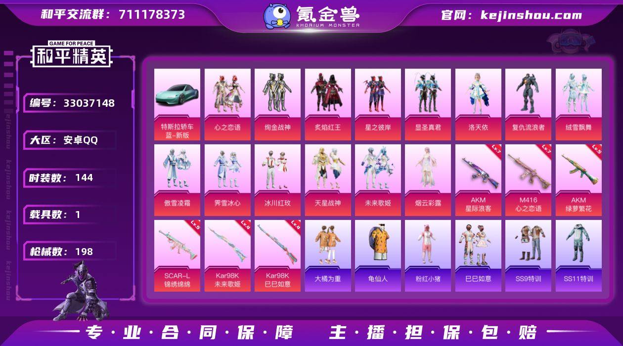 游戏人脸-安卓 手Q-14粉装-6特效枪-1载具-2粉色飞行器-70010热力值-9王牌印记-144套装-198枪皮 【热门品类】:套装-龟仙人,套装-粉红小猪 【粉色套装】:粉装-心之恋语,粉装-绚金战神,粉装-炙焰红王,粉装-星之彼岸,粉装-显圣真君,角色-洛天依,角色-复仇流浪者,粉装-绒雪飘舞,粉装-傲雪凌霜,粉装-霁雪冰心,粉装-冰川红玫,粉装-天星战神,粉装-未来歌姬,角色-烟云彩露 【粉色枪皮等级】:AKM-星际浪客(七级),AKM-绿萝繁花(五级),SCAR-L-锦绣绵绵(五级),M416-心之恋语(七级),Kar98K-未来歌姬(四级),Kar98K-巳巳如意(四级) 【粉色载具】:特斯拉Roadster(水滴蓝) 【粉色枪皮】:AKM-星际浪客,AKM-绿萝繁花,SCAR-L-锦绣绵绵,M416-心之恋语,Kar98K-未来歌姬,Kar98K-巳巳如意 【粉色飞行器】:梦幻火箭飞行器,天之羽翼飞行器 【粉色降落伞】:梦幻火箭降落伞,四圣焕新降落伞,银刃赛罗降落伞,星之彼岸降落伞,枪炮玫瑰降落伞,林间仙鹿降落伞,齐天大圣降落伞,流星咚咚降落伞,炙焰牛王降落伞,环太平洋降落伞,绒雪飘舞降落伞,垂柳戏鸭降落伞,彩虹甜喵降落伞,暗夜鎏金降落伞,仲夏莫吉托降落伞,炎氏战神降落伞,未来歌姬降落伞 【稀有套装】:套装...