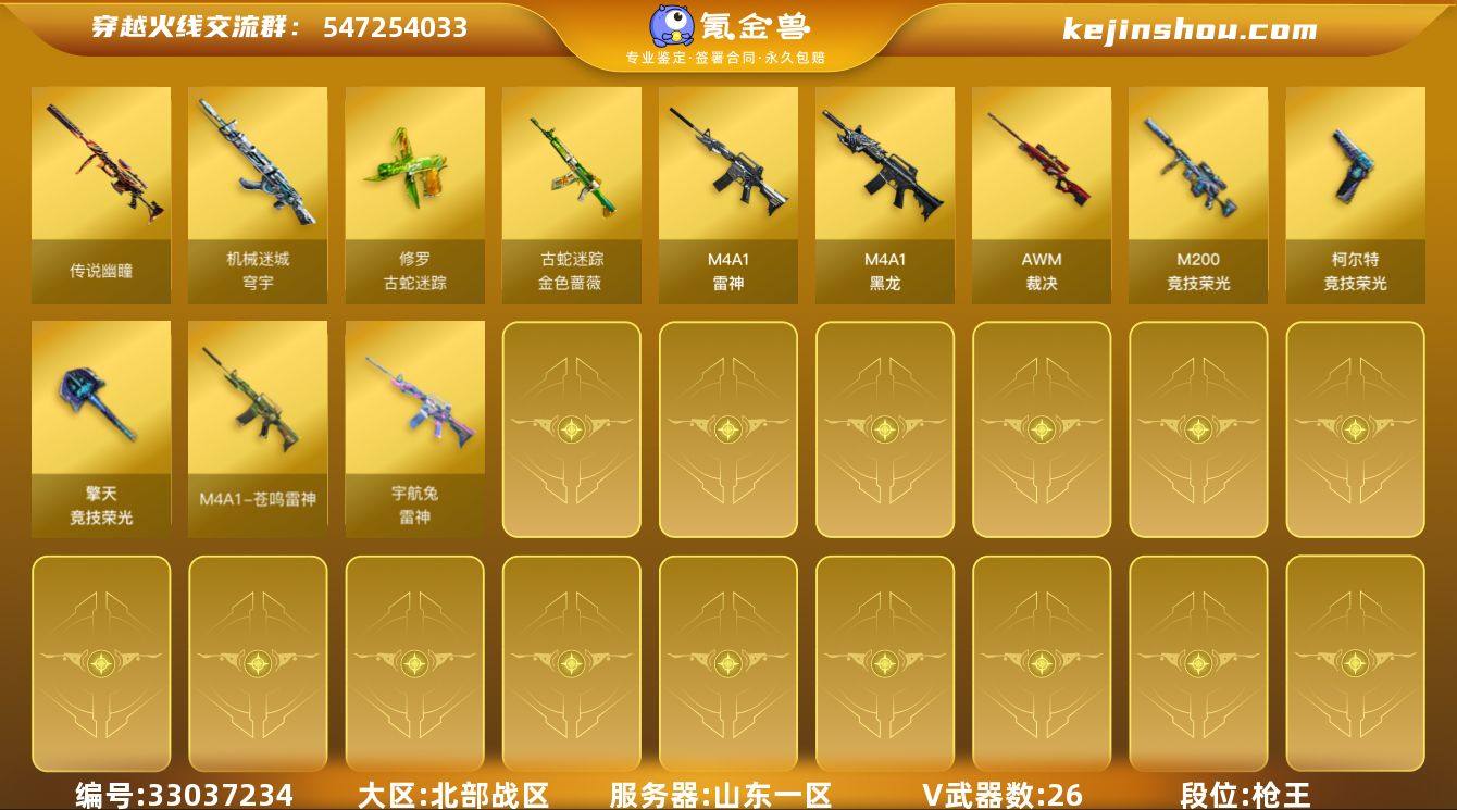 【ky6754】山东一区-30V-2王者武器数-0炫金武器数 【传说武器】:传说幽瞳 【热门武器】:传说幽瞳,金色蔷薇-古蛇迷踪,修罗-古蛇迷踪,M200-竞技荣光,死亡之眼 【音效卡】:屠龙-电竞之星-竞星跃动音效卡,HK417-朱雀-电竞之星-竞星跃动音效卡 【皮肤】:裁决-星际旅行 皮肤,幻影-破浪逐光 皮肤*2,雷神-宇航兔皮肤,屠龙-破浪逐光 皮肤*2 【角色】:智,不败狙神,蛇隐宗,幻面灵狐,斗烈龙骑,芳心审判者,风暴女,兰妹妹,龙儿-小淘气,蛇姬,蜀雪,新娜塔莎,雪莉杨-摸金校尉,影武者-X,团团 【人偶武器】:迷你深渊冰龙,生化手雷-机甲核心*2,灵狐娃娃手雷*2 【暴走生化】:死亡之眼 【挑战大师】:AK47-冰龙粉碎者 【英雄级武器】:M4A1-黑龙,M4A1-雷神,金色蔷薇-古蛇迷踪,HK417-朱雀-电竞之星,机械迷城-穹宇,AWM-裁决,M200-竞技荣光,柯尔特-竞技荣光,修罗-古蛇迷踪,擎天-竞技荣光,屠龙-电竞之星,屠龙-斗烈龙驹,高爆手雷-竞技荣光,高爆手雷-神工天巧,高爆手雷-古蛇迷踪,高爆手雷-雷暴王者,闪光弹-竞技荣光,闪光弹-神工天巧,闪光弹-量子之心,烟雾弹-竞技荣光*3,烟雾弹-神工天巧*2,烟雾弹-古蛇迷踪,烟雾弹-雷暴王者,烟雾弹-量子之心*2,M4A1...