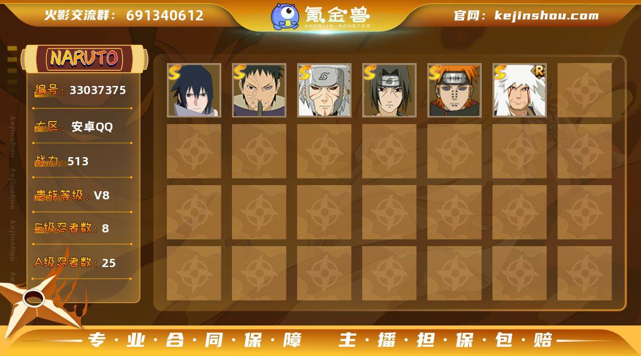 V8 8S忍 25A忍 16通灵 513W战力 可二次 可修改实名 【S级忍者】宇智波佐助「永恒万花筒」,宇智波带土 「忍界大战」,自来也 「舞之豪杰」,波风水门「九喇嘛连结」,漩涡鸣人·宇智波佐助,千手扉间「秽土转生」,宇智波鼬 「须佐能乎」,佩恩「天道」 【通灵兽】熊猫