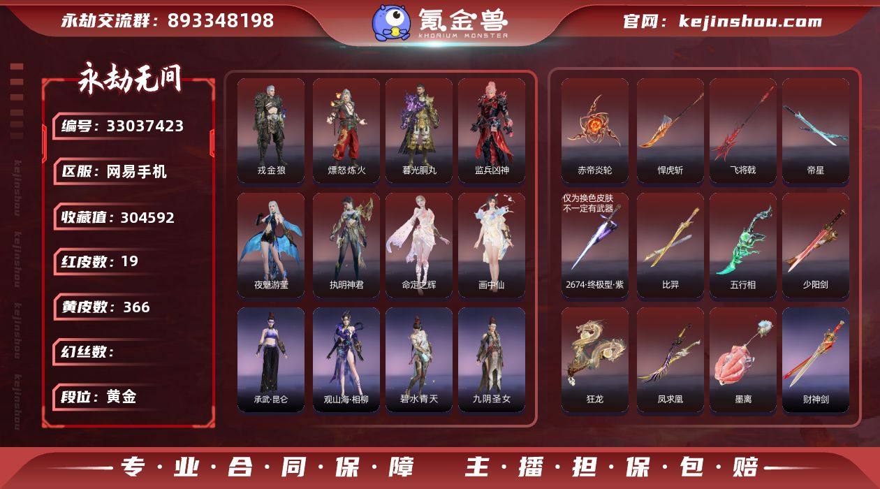 19红366金, 总收藏值304592, 幻丝34326, 等级314, 三排白银1, 通行证未升级Lv.2, 19红色神品: 戎金狼/熛怒炼火/暮光胴丸/监兵凶神/夜魅游莹/执明神君/命定之辉/画中仙/少阳剑/帝星/比羿/悍虎斩/飞将戟/五行相/狂龙/凤求凰/赤帝炎轮/墨离