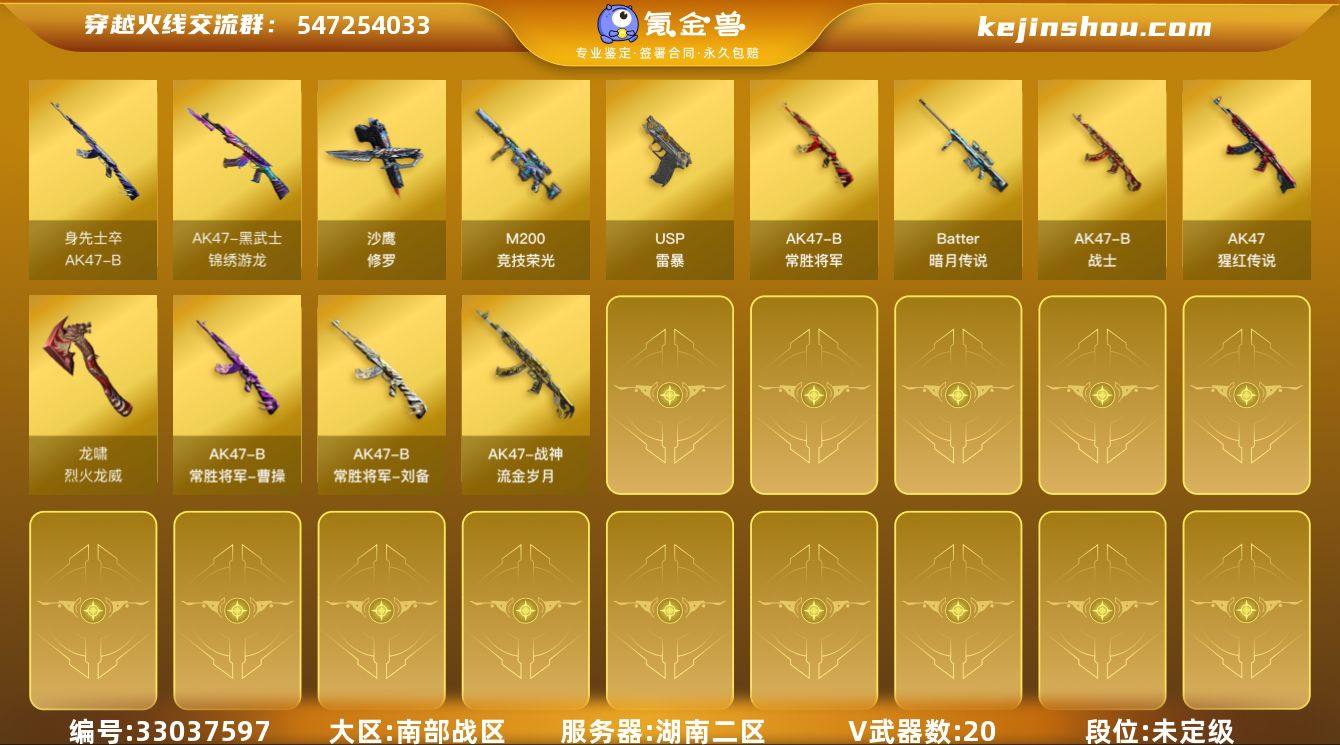 湖南二区-21V-0王者武器数-0炫金武器数 【热门武器】:M200-竞技荣光,USP-雷暴,沙鹰-修罗 【音效卡】:Barrett-碧霄极光音效卡*2,麒麟刺-百战金芒-盛典舞曲音效卡,炼狱-百战金芒-庆典舞曲音效卡 【皮肤】:M4A1-再燃火线,战神-流金岁月皮肤,AK47-B-常胜将军-曹操*2,AK47-B-常胜将军-刘备,修罗-百战金芒 皮肤,轻型军用手斧-再燃火线 【角色】:零·纪元,云海玲珑,葵-阿尔法武装,暗夜-X,初恋灵狐,电竞少女,芳心审判者,风暴女,娟娟,灵狐者-X,潘多拉-X,潜龙队-X,青霞仙子,斯沃特-X,新娜塔莎,雪莉杨-摸金校尉,樱-战斗天使,影武者-X,游珑儿,团团 【人偶武器】:夺魂,迷你牛牛,灵狐娃娃手雷 【挑战大师】:冰龙粉碎者-白马银枪,神圣爆裂者-末日III 【英雄级武器】:黑武士-锦绣游龙,AK-47-猩红传说,AK47-B-常胜将军,机械迷城-穹宇,AK47-B-身先士卒,AK47-B-战士,M200-竞技荣光,Barrett-暗月传说,炼狱-百战金芒,沙鹰-修罗,USP-雷暴,麒麟刺-百战金芒,龙啸-烈火龙威,手雷-云海游龙,闪光弹-竞技荣光,烟雾弹-竞技荣光,M4A1-苍鸣雷神,AK47-竞魂无影,Barrett-碧霄极光 【其他武器】:源·火麒麟*4,御·火麒麟-平天大圣,御·黑龙-龙太子,源·...