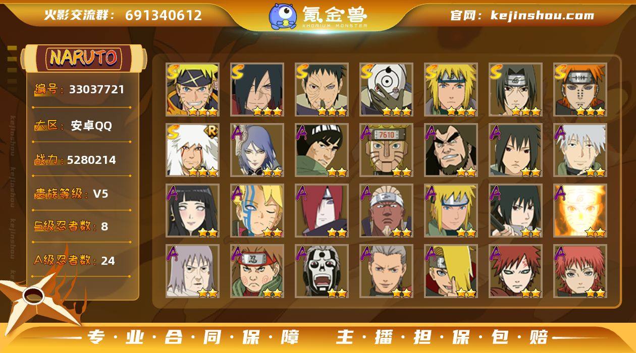 8S忍/24A忍/战力528W/V5/区服3610 【S忍者】 宇智波佐助「漩涡鸣人」,宇智波斑「秽土转生·解」,宇智波带土「忍界大战」,自来也「舞之豪杰」,宇智波斑「白面具」,宇智波鼬「须佐能乎」,佩恩「天道」,波风水门, 【A忍者】 小南「神驹佑将」,机械鸣人「初始形态」,迈特凯「青春爆炸」,漩涡博人「桃式显现」,日向雏田「最终章」,旗木卡卡西「幻之真容」,宇智波泉奈,神农「羁绊」,长门「青年」,艾「青年」,波风水门「青年」,宇智波佐助「须佐能乎」,漩涡鸣人「九尾查克拉」,千代「近松十人卫」,秋道丁次「忍界大战」,飞段「死司凭血」,飞段,迪达拉,我爱罗「疾风传」,蝎,干柿鬼鲛,宇智波鼬,猿飞阿斯玛,迈特凯, PX_2543756
