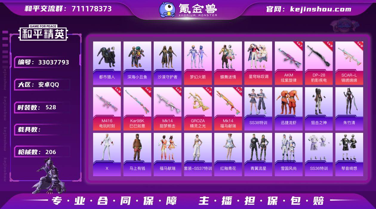 火箭少女 都市猎人 深海小丑鱼 暗影哥特 西部牛仔 沙漠守护者 浅蓝色牛仔衬衣 浪漫天命 AK47炫紫旋律满级 M4 16电玩时刻满级 SCAR-L 锦绣绵绵满级 GROZA 精灵之光三级 MK14 甜梦熊击满级