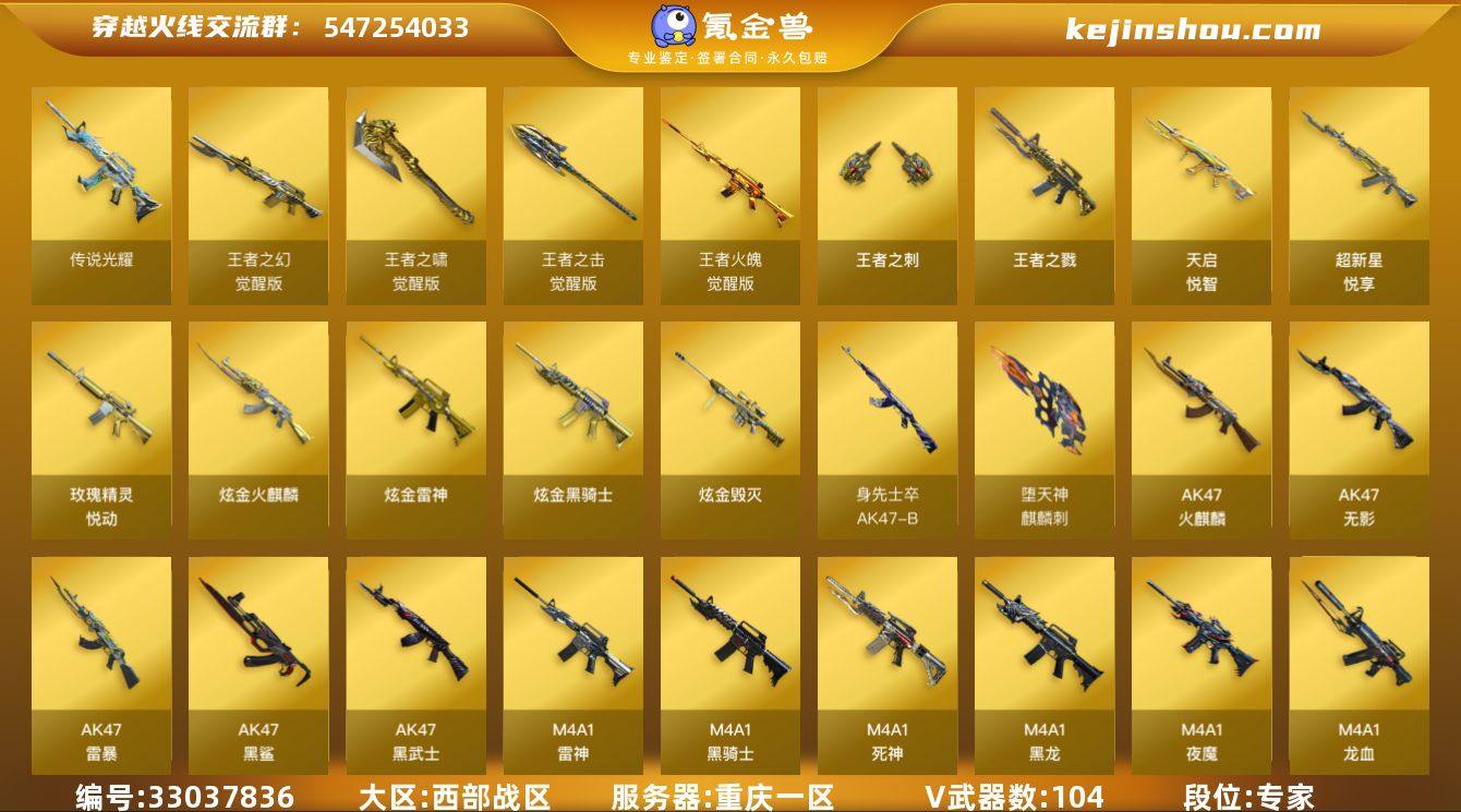 【ky6774】重庆一区-114V-14王者武器数-4炫金武器数 【传说武器】:传说光耀 【热门武器】:传说光耀,QBZ03-金色蔷薇,Scar Light-白虎,HK417-朱雀,M200-幻神*2,Kar98K-星神,金色小号,C.A.T,M4A1-黑骑士,汤姆逊-烈龙*5,加特林-炼狱*3,斯泰尔-蝴蝶,降世魔童,USP-雷暴,沙鹰-修罗*4,炽芒蝶刃*2,炽芒蝶刃-冠军炽芒皮肤 【王者炫金武器】:王者之戮,超新星-悦享,天启-悦智*2,玫瑰精灵-悦动,王者之刺*2,炫金火麒麟,炫金骑士,炫金雷神,炫金毁灭 【音效卡】:M200-幻神音效卡,M4A1-雷神音效卡,M4A1-黑骑士音效卡,Barrett-毁灭音效卡,Scar Light-白虎音效卡,白鲨语音包 【皮肤】:幻神-权 皮肤,白虎-拼搏 皮肤,QBZ03-巅峰荣耀皮肤,雷神-暗月,雷神-能量核心,雷神-星空,火麒麟-冠军之心,火麒麟-拼搏 皮肤,毁灭-暗月*2,毁灭-冠军之怒*2,毁灭-英雄计划 皮肤,黑龙-能量核心,黑龙-暗月,无影-暗月,无影-无双奉先 皮肤,死神-秘银,AK47-B-常胜将军-曹操,AK47-B-常胜将军-刘备,AK47-B-常胜将军-孙权*2,极光-能量核心,修罗-能量核心*2,天神-暗月*2,炽芒蝶刃-冠军炽芒皮肤 【角色】:葵,春,晴雅,王者-瞳-闭月羞花,芳心审判者,龙儿,雪莉杨...