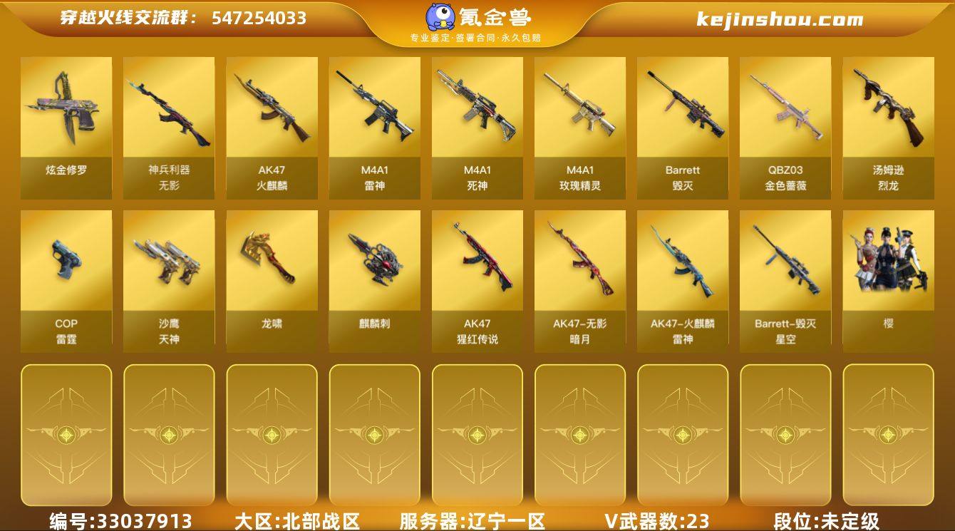 辽宁一区-24V-0王者武器数-1炫金武器数 【热门武器】:QBZ03-金色蔷薇,死亡之眼*2,汤姆逊-烈龙,加特林-炼狱 【王者炫金武器】:炫金修罗 【皮肤】:火麒麟-雷神*2,毁灭-星空,无影-暗月 【角色】:樱,嘉年华灵狐,娟娟,灵狐者-X,潘多拉-X 【人偶武器】:AWM-灵狐-15周年嘉年华,生化手雷-机甲核心 【暴走生化】:死亡之眼*2 【挑战大师】:AK47-冰龙粉碎者*2,冰龙粉碎者-白马银枪,激光毁灭者III 【英雄级武器】:AK47-火麒麟*2,M4A1-雷神,M4A1-死神,QBZ03-金色蔷薇,无影-神兵利器,M4A1-玫瑰精灵,AK-47-猩红传说,Barrett-毁灭*2,加特林-炼狱,汤姆逊-烈龙,沙鹰-天神,COP-雷霆,龙啸,麒麟刺,尼泊尔-雷霆,高爆手雷-雷霆*2,闪光弹-雷霆*2,烟雾弹-雷霆*2 【其他武器】:源-千变,源·火麒麟*3,御·火麒麟-平天大圣,火麒麟-雷神*2,御·黑龙-龙太子,源·雷神*3,魂·雷神-维纳斯,魂·雷神-15周年嘉年华,M4A1-十二生肖·龙-雷神*2,雷神-赛博朋克,源·黑骑士,魂·黑骑士-幻能朋克,魂·黑骑士-破浪10年,御·黑骑士-冰魄,魂·黑武士-锋芒破茧,源·机械迷城,源·青龙,源·天龙,AWM-裁决-百城联赛天津,源·毁灭,魂·毁灭-航天科技,魂·毁灭-神秘黑洞,灵·Barrett-...