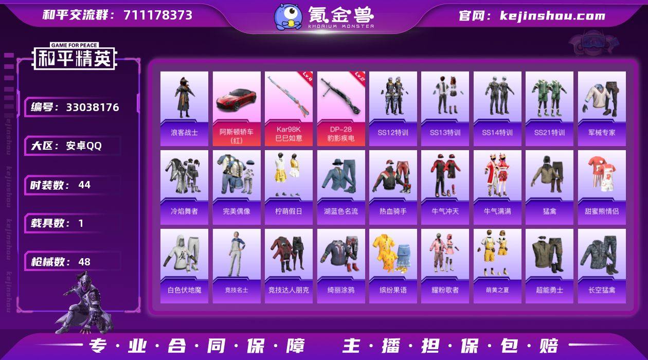 无二次TD263289安卓 手Q-0粉装-2特效枪-1载具-0粉色飞行器-14717热力值-1王牌印记-44套装-48枪皮 【热门品类】:套装-浪客战士 【粉色枪皮等级】:Kar98K-巳巳如意(四级),DP-28-豹影疾电(二级) 【粉色载具】:阿斯顿马丁DBS(红) 【粉色枪皮】:Kar98K-巳巳如意,DP-28-豹影疾电 【粉色降落伞】:四圣焕新降落伞,潮汐统领降落伞 【稀有枪皮】:AKM-夜灯,AKM-破晓战魂,M16A4-幻世战舞者,SCAR-L-浪客战士,SCAR-L-炫彩节奏,M416-红色方程式,AUG-耀粉歌者,QBZ-原初圣火,M762-天降萌叽,M762-奇异狩猎者,M762-牛气冲天,M762-第五大道,M762-镭射皇者,UZI-天降萌叽,Vector-彩虹符号,Kar98K-彩虹符号,SKS-心之恋语,SKS-浪客战士,VSS-深山诡影,VSS-镭射皇者,Mini14-原初圣火,Mini14-炫彩节奏,Mini14-马卡龙,S1897-潮汐统领,S1897-镭射皇者,DBS-第五大道,M249-彩虹符号,M249-镭射皇者,DP-28-原初圣火,DP-28-锦绣火鲤,MG3-幻世战舞者,P18C-原初圣火 【其他套装】:套装-SS12特训,套装-SS13特训,套装-SS14特训,套装-SS21特训,套装-军械专家,套装-冷焰舞者,套装-完美偶像,套装-柠萌假日,套装-湖蓝色名流,套装-热血骑手,套装-牛气冲天,套装-牛...