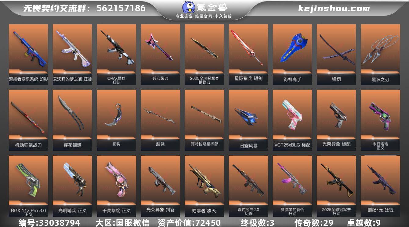 段位: 白银 套装: 光荣异象,掠影2.0套装,2025全球冠军赛 近战武器皮肤: 机动狂飙战刀,黑波之刃-塑水宗,街机高手-源能者娱乐系统,穿花蝴蝶-黑市,镭切-创·纪元,光荣异象 歧途,日耀风暴,阿特拉斯指挥部,影钩-掠影2.0,星际猎兵 短剑,2025全球冠军赛 蝴蝶刀,碎心裂刃 步枪皮肤: 狂徒-盖亚的复仇,獠犬-归零者,狂徒-堕天遗武,幻影-源能者娱乐系统,狂徒-艾沃莉的梦之翼,狂徒-全息波普//2.0,戍卫-掠影,狂徒-创·纪元,狂徒-离子武器2.0,狂徒-RGX 11z pro,狂徒-光荣异象,幻影-掠影2.0,2025全球冠军赛 狂徒,幻影-混沌序曲2.0,多弥尔的复仇 狂徒,狂徒-ORAx颗秒,超集系统 狂徒,蒙太奇 幻影,风暴之子 戍卫 佩枪皮肤: 鬼魅-盖世英雄,正义-千灵华绽,正义-RGX 11z Pro 3.0,正义-光明哨兵,标配-VCT25xBLG,标配-光荣异象,鬼魅-掠影2.0,正义-末日泡泡,超集系统 标配,风暴之子 正义 狙击枪皮肤: 飞将-塑水宗,冥驹-光荣异象,风暴之子 冥驹,超集系统 飞将 冲锋枪皮肤: 骇灵-掠影2.0,蒙太奇 骇灵 霰弹枪皮肤: 判官-光荣异象,风暴之子 雄鹿 机枪皮肤: 奥丁-掠影2.0,蒙太奇 战神 亮点: 【优质装备】:2025全球冠军赛,2025全球冠军赛 蝴蝶刀,幻影-源能者娱乐系统,狂徒-艾沃莉的梦之翼,狂徒-盖亚的复仇,獠犬-...