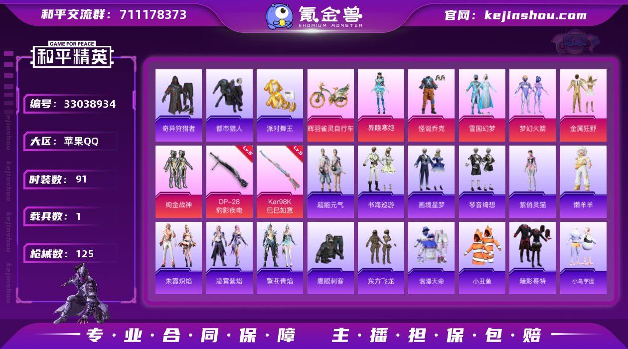 YZJ16678 可二次 苹果Q-1红装5稀有1载具6粉装3特效枪11热门91套装125枪皮 38647热力值 极品精氪红装男神身法素材号 3级红装艾丽娅 小丑 雪国 新火箭少女 都市 金鞋 绚金战神 金属狂野 红眼罩 奇异狩猎者 狂沙 小丑鱼 东方飞龙 JTeam追光队服 4印记 历史超级王牌7星 【1红装】 暮色玫影-艾丽娅 (3级) 【5稀有】 奇异狩猎者 都市猎人 浪漫天命 派对舞王 派对舞王(金靴子) 【1载具】 辉羽雀灵自行车 【6粉装】 梦幻火箭 雪国幻梦 异瞳寒姬 怪诞乔克 金属狂野 绚金战神 【3特效枪】 Kar98K-巳巳如意 (5级) DP-28-豹影疾电 (5级) Mk14-福马献瑞 (4级) 【11热门】 小丑鱼 东方飞龙 鹰眼刺客 JTeam追光队服 暗影哥特 水银刺客 狂沙舞者 漫步者 破蛋小黄鸡 M24-奇异狩猎者 S686-奇异狩猎者 【1飞行器】 幻海精灵飞行器 【2头盔】 梦幻火箭头盔 雪国精灵头盔 【2背包】 梦幻火箭背包 雪国精灵背包 营地ID:983316421