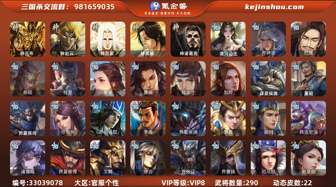 【4840】官阶:骠骑将军;VIP等级:VIP8;史诗武将数量:23;动态皮肤数量:22;武将总数:290;史诗宝珠数量:1;将魂数量:5608;神将:3;魏国史诗武将:8;蜀国史诗武将:3;吴国史诗武将:2;群史诗武将:8