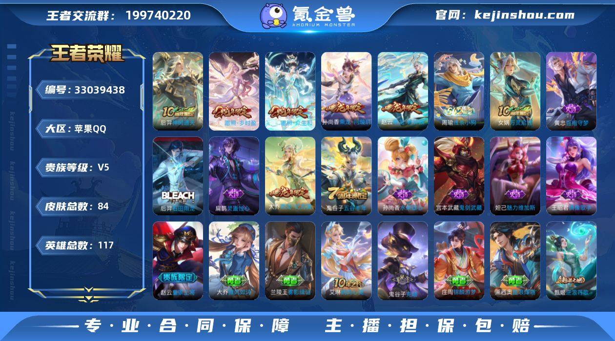 实名: 可修改 贵族等级: V5 英雄数: 117 皮肤数: 84 传说皮: 乘龙·问璇玑,乘龙·铭钟鼎,神树通天 限定皮: 五谷丰年,愿照·众生和,愿照·岁时盈