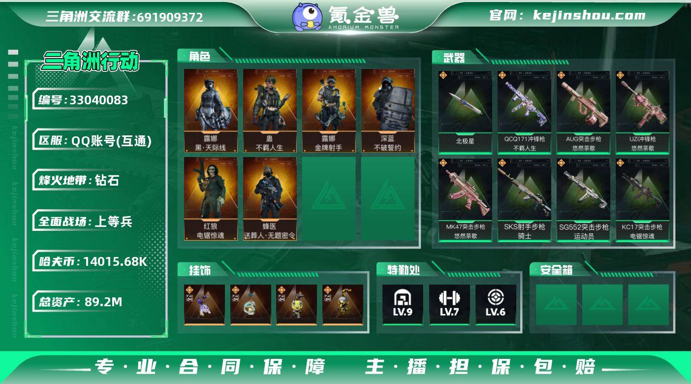 连体王者贵族7 荣耀典藏1 无双2 珍品传说2 传说皮肤11 星元套装12 史诗皮肤57 皮肤数量230 英雄126 总场次9216总资产90.4M,哈夫币1400w,近战2 枪皮数量284,露娜-黑天际线/红狼-电锯惊魂/深蓝-不破誓约/蜂医-送葬人无题密令/露娜-金牌射手,近战-北极星/近战-黑鹰,战场等级30列兵,行动等级60钻石,安全箱、典藏皮肤颜色请以游戏内数据为准,详情请看图