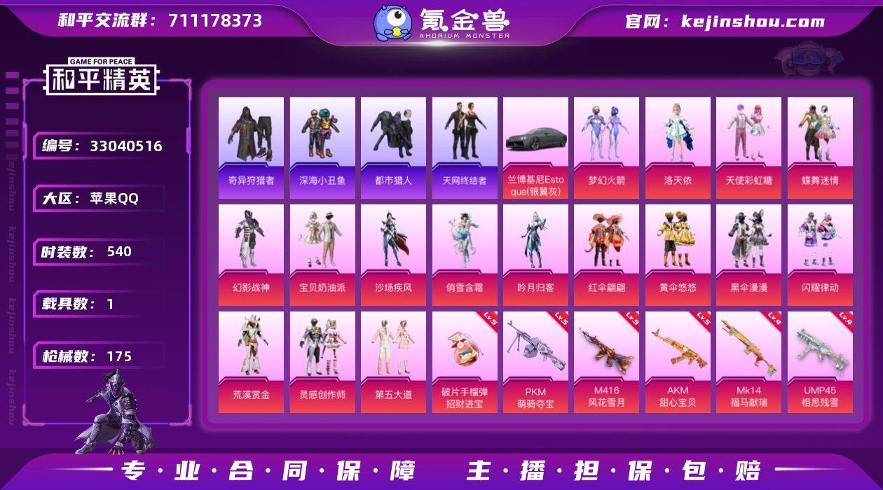 精氪追猎号天网/暗夜之虎/都市/新101/幻影战神/【16粉装-13粉枪-1载具1僚机-2珍稀飞行器-143套装-175枪皮-49局内动作】实名: 可修改 时装数: 540 载具数: 1 枪械数: 175 战备数: 116 热门装扮: 奇异狩猎者,梦幻火箭(新101),蝶舞迷情,红伞翩翩,幻影战神,呆萌铁蟹,深海小丑鱼,宝贝奶油派,浪漫波比,天使彩虹糖,迅捷狂鲨,鹰眼刺客,都市猎人,黄伞悠悠,沙场疾风,俏雪含霜,吟月归客,洛天依,黑伞漫漫,闪耀律动,荒漠赏金,灵感创作师,第五大道,暗夜魅影 载具: 兰博基尼Estoque(银翼灰),僚机-萌兔起飞 稀有枪皮: MG3洛神天依,AKM甜心宝贝,UMP45相思残雪,M416风花雪月,Kar98k绿意幻情,S12K海渊国主,GROZA焦糖拿铁,SCAR-L青春物语,AUG妙趣可丽,M417第五大道,破片手榴弹-招财进宝,PKM-萌骑夺宝