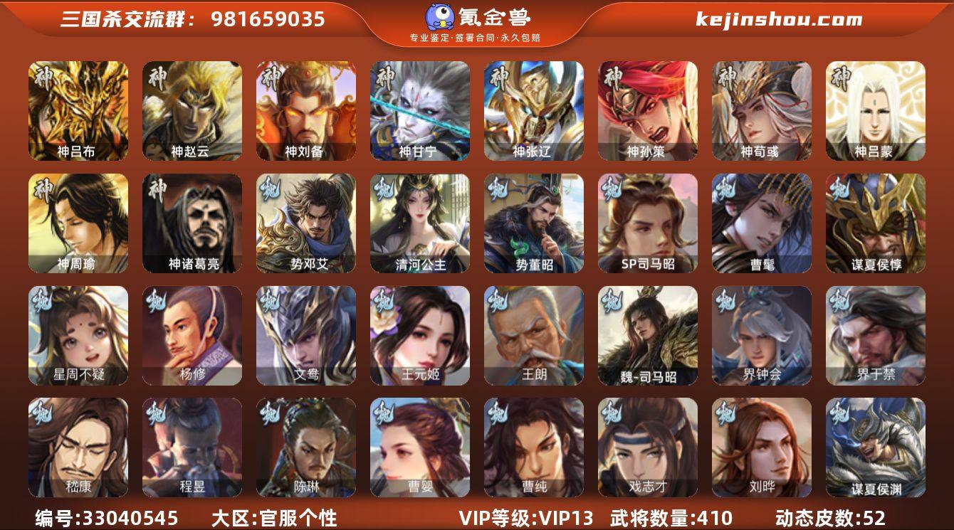VIP等级: VIP13 官阶: 大将军 武将数量: 410 动态皮肤数量: 52 神将: 神甘宁,神刘备,神吕布,神孙策,神荀彧,神张辽,神赵云,神吕蒙,神周瑜,神诸葛亮 魏国武将: 刘晔,戏志才,曹纯,曹婴,陈琳,程昱,嵇康,界于禁,界钟会,魏-司马昭,王朗,王元姬,文鸯,杨修,唐咨-魏,徐庶,张辽,SP蔡文姬,SP曹仁,SP关羽,SP贾诩,SP姜维,SP庞德,卞夫人,蔡贞姬,曹昂,曹操,曹冲,曹洪,曹丕,曹仁,曹叡,曹嵩,王异,张恭,鲁芝,界满宠,曹休,界曹植,满宠,荀攸,王基,钟繇,郭嘉,牵招,荀彧,杜畿,界郭嘉,崔琰,界曹丕,界荀彧,朱灵,吕虔,界王异,界许褚,界郭淮,华歆,陈群,界典韦,界曹休,谋甄姬,司马孚,袁涣,李通,乐进,辛宪英,郭淮,毛玠,界曹彰,郭皇后,夏侯惇,曹植,司马朗,谋于禁,界曹操,星周不疑,许褚,界张辽,张郃,钟会,文聘,曹彰,界夏侯惇,诸葛诞,司马懿,甄姬,徐晃,孙资刘放,韩浩史涣,胡班,曹真,典韦,界夏侯渊,夏侯渊,李典,于禁,邓艾,界司马懿,张春华,臧霸,牛金,朱灵(国战),谋夏侯惇,曹髦,清河公主,SP司马昭,司马伷,董昭,势董昭,王经,谋夏侯渊,势邓艾 蜀国武将: 董允,关索,花鬘,界黄忠,谯周,沙摩柯,王平,张星彩,赵襄,诸葛瞻,谋马超,谋赵云,谋夏侯氏,马云騄,徐庶,杨仪,吕凯,界关羽,界诸葛亮,邓芝,界伊籍,费祎,严颜,界黄月英...
