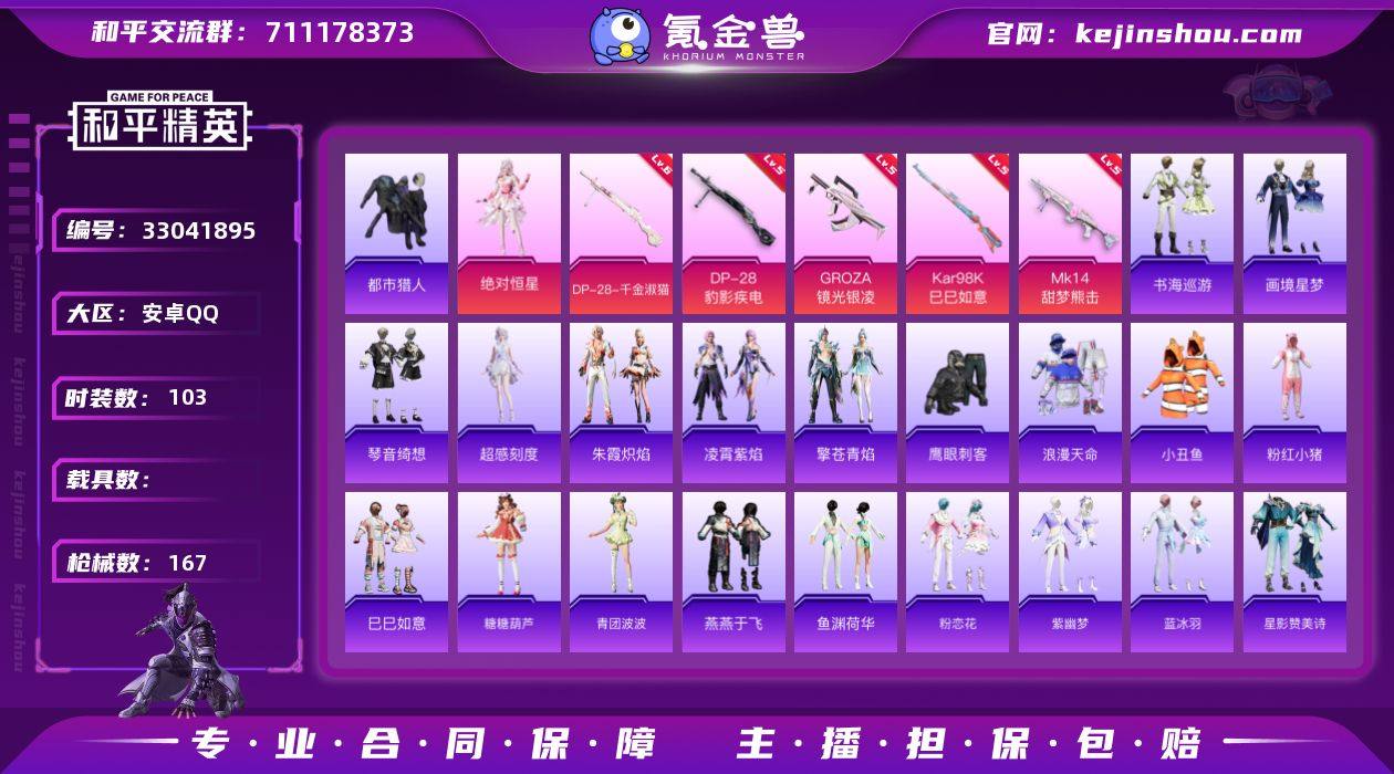 【AZH3145】安卓 手Q【都市小丑鱼浪漫天命】2粉装-6特效枪-0载具-1粉色飞行器-39813热力值-2王牌印记-103套装-167枪皮 【热门品类】:套装-浪漫天命,套装-都市猎人,套装-小丑鱼,套装-粉红小猪 【粉色套装】:角色-绝对恒星,角色-罪夜之冕 【粉色枪皮等级】:GROZA-镜光银凌(五级),AKS-74U-森灵之息(五级),Kar98K-巳巳如意(五级),Mk14-甜梦熊击(五级),DP-28-千金淑猫(六级),DP-28-豹影疾电(五级) 【粉色枪皮】:GROZA-镜光银凌,AKS-74U-森灵之息,Kar98K-巳巳如意,Mk14-甜梦熊击,DP-28-千金淑猫,DP-28-豹影疾电 【粉色飞行器】:炫彩糖果飞行器 【粉色降落伞】:绝对恒星降落伞,临安公主降落伞,冷漠罗丽降落伞,异瞳寒姬降落伞,炫彩糖果降落伞 【稀有套装】:套装-巳巳如意,角色-超感刻度,套装-雪国风尚,套装-炫彩糖果,套装-糖糖葫芦,套装-青团波波,套装-燕燕于飞,套装-鱼渊荷华,套装-粉恋花,套装-紫幽梦,套装-蓝冰羽,套装-星影赞美诗,套装-彩虹兔,套装-云朵鹅,套装-雪绒豹,角色-绛羽幽主,套装-朱霞炽焰,套装-凌霄紫焰,套装-擎苍青焰,套装-书海巡游,套装-画境星梦,套装-琴音绮想,套装-红釉青花 【稀有枪皮】:AUG-冰晶雪宝,AKM-影袭,A...