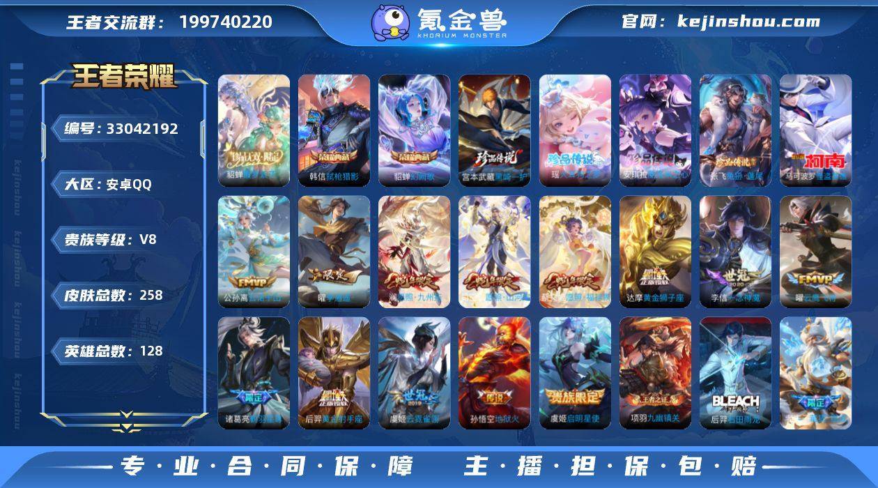 【王者荣耀】珍品无双1 典藏2 无双0 珍品传说5 传说16 史诗71 英雄128 皮肤258 贵族8级 珍品无双:馥梦繁花__荣耀典藏:幻阙歌|弑枪猎影__珍品传说:怪盗基德|兔狲·蓬尾|大耳狗之梦|酷洛米之心|黑崎一护__传说皮肤:启明星使|地狱火|云霓雀翎|黄金狮子座|黄金射手座|刘备-时之恋人|一念神魔|云鹰飞将|李逍遥|鹤羽星尊|孙尚香-末日机甲|云缨-鹤归松栖|愿照·山河定|愿照·九州拓|愿照·福禄聚|云诺千山__稀有限定:蔷薇恋人|李小龙|山海·玄木吟|繁星吟游|古海寻踪|海滩派对|海盐诗旅|胡桃异想国|皇家上将|混沌棋|剑破天穹|江河有灵|金庭之子|黎明之约|魔术师|花木兰-默契交锋|千军破阵|擒涛扼浪|驱傩正仪|荣光圣徽|朔风刀|探海日志|饕餮|醍醐杖|天穹祈灯|万华元夜|无心|五谷丰年|纤云弄巧|演武夺筹|阴阳师|优雅恋人|御旌|御銮|暗隐猎兽者|缤纷独角兽|冰冠公主|冰雪圆舞曲|乘风破浪|大乔-猫狗日记|地狱岩魂|电玩·爆裂旋风|功夫厨神|鬼剑武藏|黄金分割率|节奏热浪|金属风暴|李元芳-蔬乡物语|龙骑士|魅力维加斯|魅语|女仆咖啡|绅士熊喵|圣诞狂欢|圣诞恋歌|水果甜心|水晶猎龙者|孙策-猫狗日记|天才门将|天秀·启明|晚萤|赵云-未来纪元|星夜王子|摇滚巨星|鹰眼统帅|幽灵船长|遇见神鹿|逐浪之...