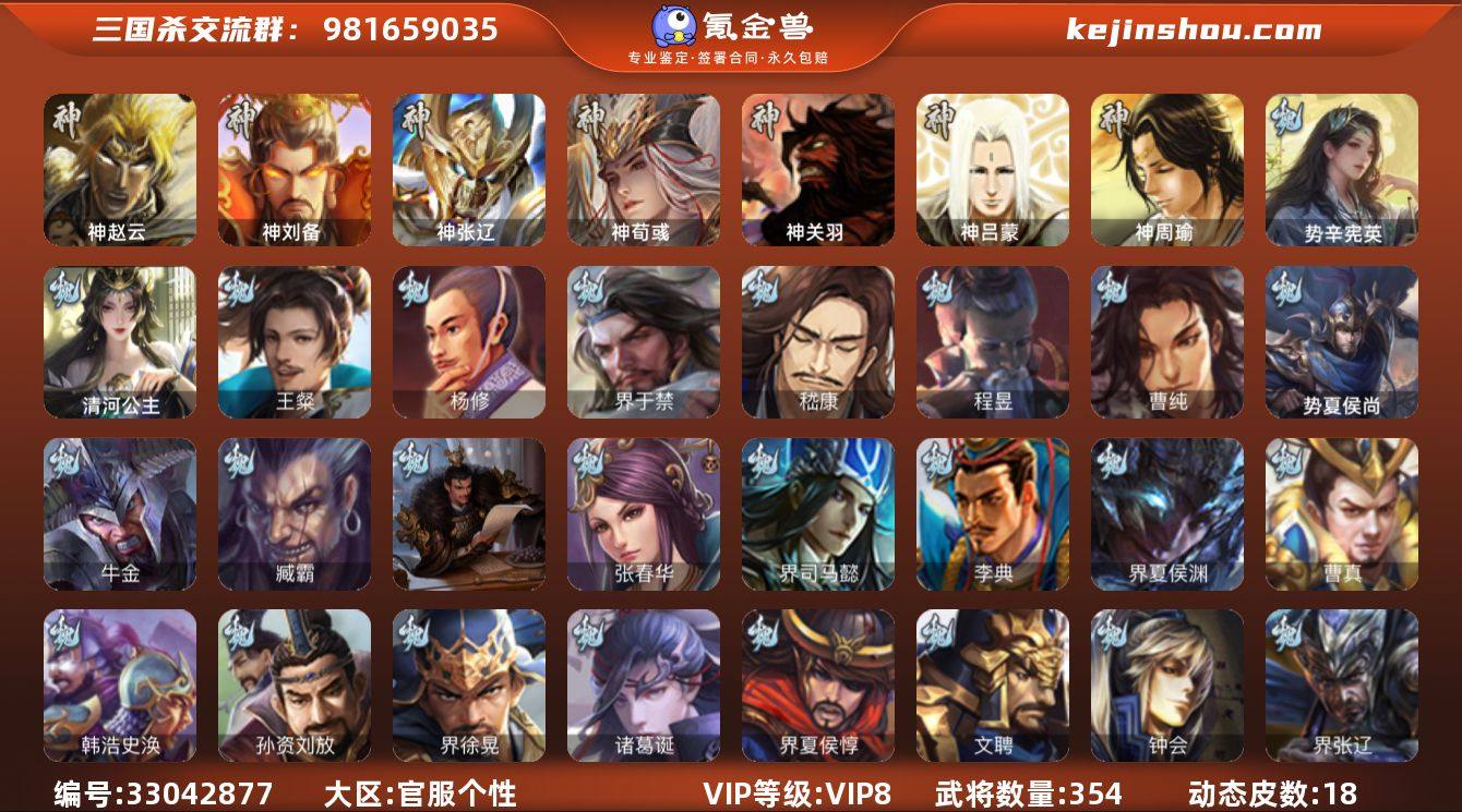 【14789982】官阶:骠骑将军;VIP等级:VIP8;史诗武将数量:23;动态皮肤数量:18;武将总数:354;史诗宝珠数量:0;将魂数量:2093;神将:4;魏国史诗武将:7;蜀国史诗武将:5;吴国史诗武将:1;群史诗武将:5