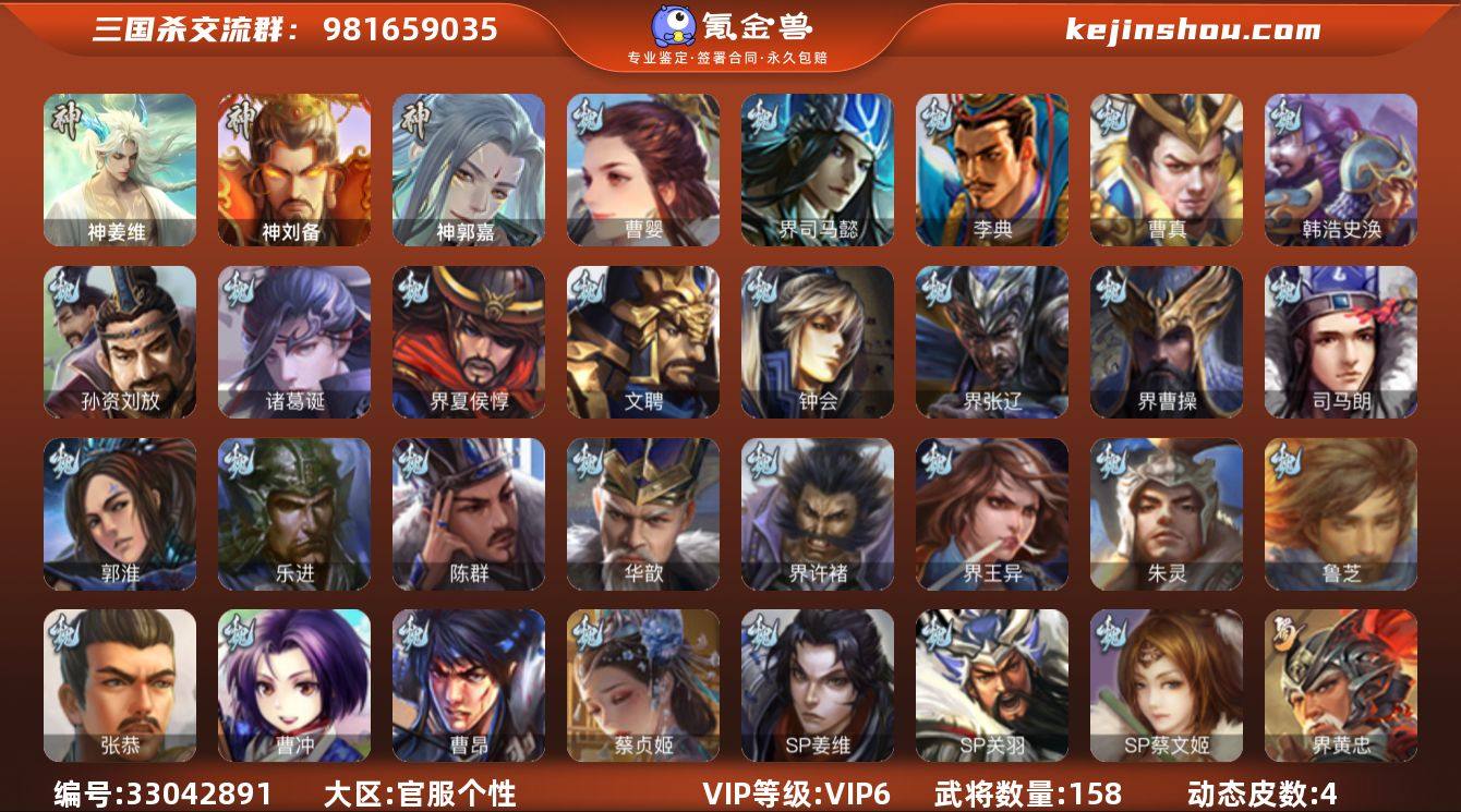 【14789985】官阶:先锋将军;VIP等级:VIP6;史诗武将数量:7;动态皮肤数量:4;武将总数:158;史诗宝珠数量:0;将魂数量:5954;神将:3;魏国史诗武将:2;蜀国史诗武将:1;吴国史诗武将:1;群史诗武将:1
