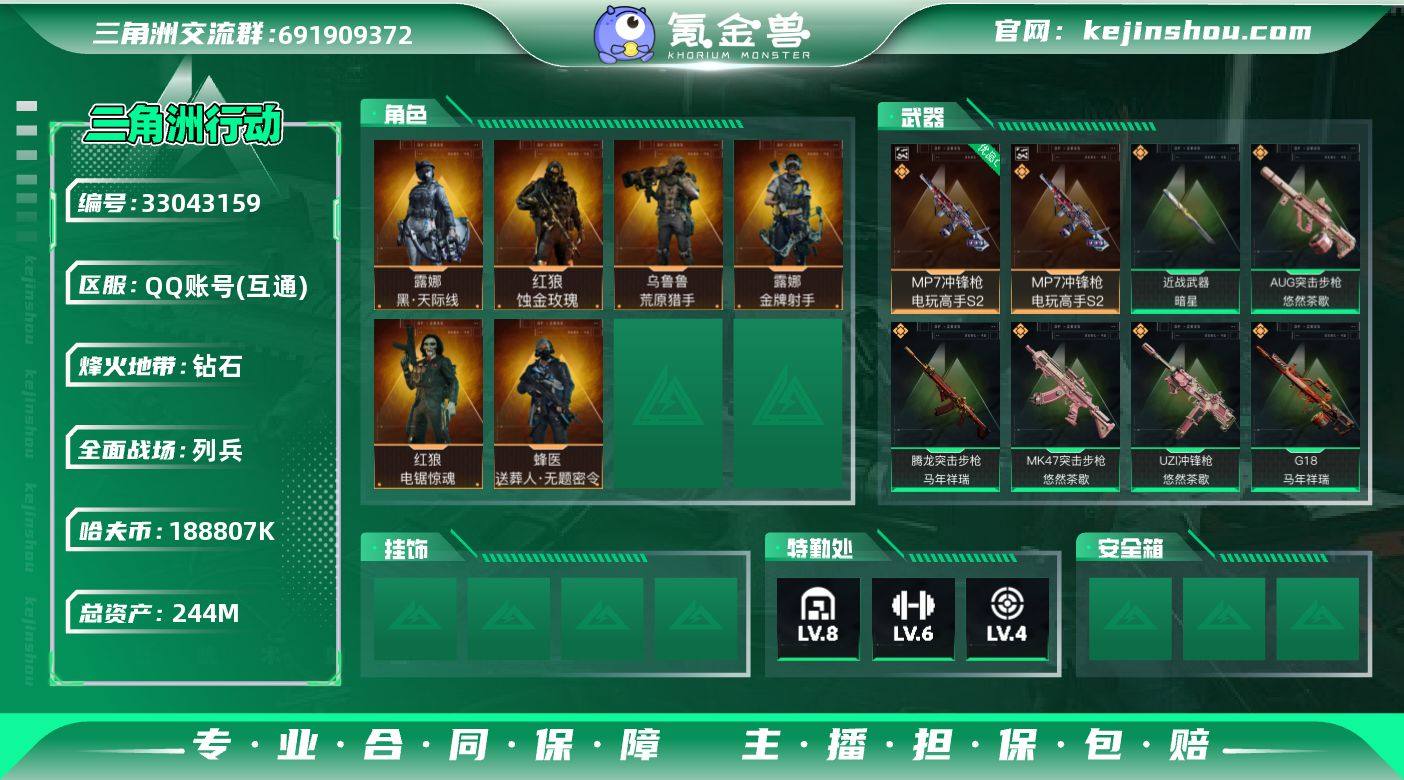 【SJZG4630】总资产(M):244M/哈夫币(K):188807K/哈夫币(K):188807K/传说枪皮数:27/全面战场等级:10_段位:列兵/烽火地带等级:60_段位:钻石/红狼-蚀金玫瑰/露娜-黑·天际线/蜂医-送葬人·无题密令(S5)/红狼-电锯惊魂/露娜-金牌射手(S7)/乌鲁鲁-荒原猎手/近战-暗星/近战-黑鹰/MP7冲锋枪-电玩高手S2/优品C典藏武器外观-MP7冲锋枪-电玩高手S2/M4A1突击步枪-蚀金玫瑰/M4A1突击步枪-阿米娅/AKM突击步枪-锦绣/K416突击步枪-行动记录/AUG突击步枪-悠然茶歇/SG552突击步枪-运动员/AK-12突击步枪-特斯拉线圈/SCAR-H战斗步枪-启航/G3战斗步枪-骑士/腾龙突击步枪-捞点薯条/腾龙突击步枪-马年祥瑞/K437突击步枪-锦绣/KC17突击步枪-电锯惊魂/MK47突击步枪-悠然茶歇/UZI冲锋枪-特斯拉线圈/UZI冲锋枪-悠然茶歇/SMG-45冲锋枪-锦绣/SR-3M紧凑突击步枪-特斯拉线圈/勇士冲锋枪-能天使-午夜邮差/725双管霰弹枪-送葬人-无题密令/M250通用机枪-骑士之心/M14射手步枪-蛮荒/AWM狙击步枪-捞点薯条/G18-马年祥瑞/93R-捞点薯条/复合弓-黑-天际线/ASh-12战斗步枪-无极限/K416突击步枪-腊梅/K416突击步枪-阿萨拉特攻/AUG突击步枪-蝮蛇/M7战斗步枪-百步穿杨/SCAR-H战斗步枪-囚徒/G3战斗步枪-流沙送葬/AS...