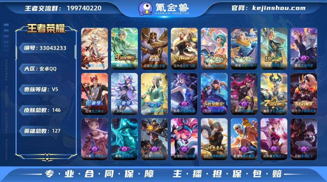 W14956 可立即换绑无需挂单养号 背包有荣耀水晶 铭文满级 传说4 按键6 夺宝5 安卓Q-V5-永恒钻石I段位-127英雄-146皮肤-4传说-45史诗 【英雄全皮】:孙权全皮,空空儿全皮 【传说皮肤】:澜愿照九州拓,桑启鸣野蒿,花木兰冠军飞将,后羿黄金射手座 【限定皮肤】:狄仁杰阴阳师,赵云皇家上将,孙尚香蔷薇恋人,高渐离玩趣恶龙,达摩沙漠行僧,项羽海滩派对,王昭君午后时光,兰陵王金庭之子,李元芳云中旅人,鬼谷子五谷丰年,苏烈千军破阵,梦奇顽趣,沈梦溪大漠名商,裴擒虎擒涛扼浪,狂铁电玩高手,上官婉儿梁祝,鲁班大师探海日志,桑启海盐诗旅,张良古海寻踪,鬼谷子天穹祈灯,刘邦剑破天穹,程咬金群星魔术团,刘备异域游侠,周瑜熔金海岸 【年限皮肤】:澜愿照九州拓 【赛季限定】:苏烈千军破阵,达摩沙漠行僧,兰陵王金庭之子,沈梦溪大漠名商,李元芳云中旅人,桑启海盐诗旅,裴擒虎擒涛扼浪,鲁班大师探海日志,张良古海寻踪,鬼谷子天穹祈灯,刘邦剑破天穹,东皇太一噬灭天穹,太乙真人谧流熔炉,甄姬逆浪荇歌,亚瑟荣光之誓,梦奇顽趣 【战令限定】:狂铁电玩高手,王昭君午后时光,孙膑茶境仙,马超访茗客,周瑜线条小狗,小乔线条小狗 【史诗皮肤】...