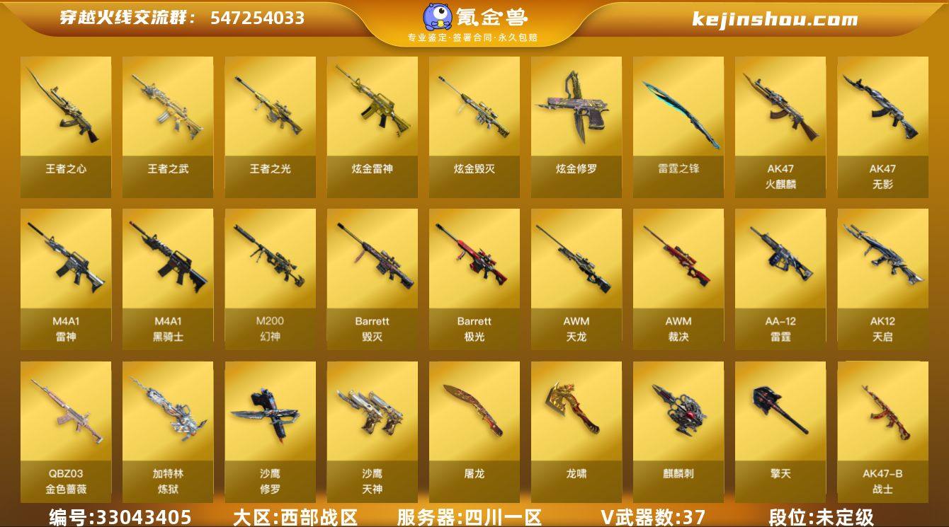 【自带包赔 最高三倍】:西部战区:四川一区-LV91-元首-未定级-37V-3王者武器数-4炫金武器数 【热门武器】:QBZ03-金色蔷薇*2,M200-幻神,M4A1-黑骑士*2,加特林-炼狱,沙鹰-修罗*2 【王者炫金武器】:王者之武,王者之心,王者之光,炫金雷神*2,炫金毁灭,炫金修罗 【音效卡】:Barrett-毁灭音效卡 【皮肤】:雷神-能量核心,火麒麟-冠军之心,火麒麟-平天大圣,毁灭-战神张飞,黑龙-暗月*2,战神-粉色甜心皮肤,战神-紫绶金章皮肤*8,战神-流金岁月皮肤*5,AWM-天龙-传奇70KG,极光-能量核心,修罗耀金皮肤,屠龙-荣耀之锋 【角色】:灵狐者-黄金海岸,潘多拉-X,潜龙队-X,铁骑-乘风破浪 【人偶武器】:迷你深渊冰龙,迷你牛魔王,闪光弹-小乔 【挑战大师】:神圣爆裂者III 【英雄级武器】:AK47-火麒麟,M4A1-雷神,M4A1-黑骑士*2,AK47-无影*2,AK12-天启,QBZ03-金色蔷薇*2,AK-47-猩红传说*8,AK47-B-战神,AK47-B-战士,AWM-天龙,Barrett-毁灭,Barrett-极光,AWM-裁决,M200-幻神,加特林-炼狱,AA-12-雷霆,沙鹰-修罗*2,沙鹰-天神,屠龙,龙啸,擎天,麒麟刺,尼泊尔-雷霆,高爆手雷-雷霆,闪光弹-雷霆,烟雾弹-雷霆 道具、段位等以实际验号为准。如账...