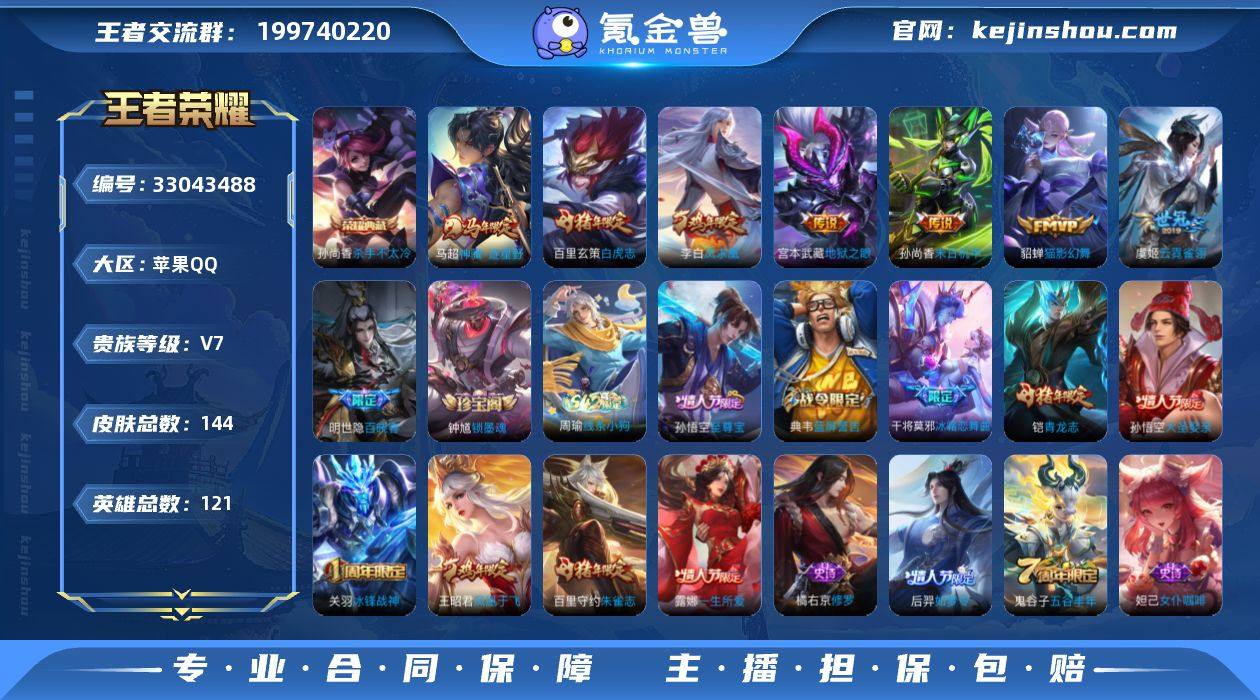 苹果Q-V7-至尊星耀I段位-121英雄-144皮肤-1典藏皮肤-7传说-37史诗 【荣耀典藏】:孙尚香杀手不太冷 【传说皮肤】:马超神骥逐星野,貂蝉猫影幻舞,虞姬云霓雀翎,百里玄策白虎志,李白凤求凰,孙尚香末日机甲,宫本武藏地狱之眼 【限定皮肤】:白起狰,狄仁杰阴阳师,赵云皇家上将,墨子神迹守卫,嬴政白昼王子,庄周蜃楼王,孙膑妖精王,扁鹊炼金王,吕布猎兽之王,周瑜赤莲之焰,夏侯惇朔风刀,典韦蓝屏警告,马可波罗逐梦之星,狄仁杰魔术师,狄仁杰万华元夜,达摩星际陆战队,达摩沙漠行僧,项羽海滩派对,老夫子醍醐杖,老夫子航海奇遇记,关羽冰锋战神,程咬金演武夺筹,露娜一生所爱,王昭君凤凰于飞,兰陵王金庭之子,亚瑟狮心王,孙悟空至尊宝,孙悟空大圣娶亲,牛魔御旌,后羿如梦令,李元芳云中旅人,钟馗驱傩正仪,女娲朔望之晖,干将莫邪冰霜恋舞曲,鬼谷子原初探秘者,鬼谷子五谷丰年,铠青龙志,百里玄策白虎志,百里守约朱雀志,弈星混沌棋,沈梦溪大漠名商,明世隐疑决卦,狂铁御狮,米莱狄御霄,米莱狄胡桃异想国,伽罗天狼溯光者,盾山御銮 【年限皮肤】:王昭君凤凰于飞,李白凤求凰,百里玄策白虎志,百里守约朱雀志,铠青龙志 【赛季限定】:亚瑟狮心王...