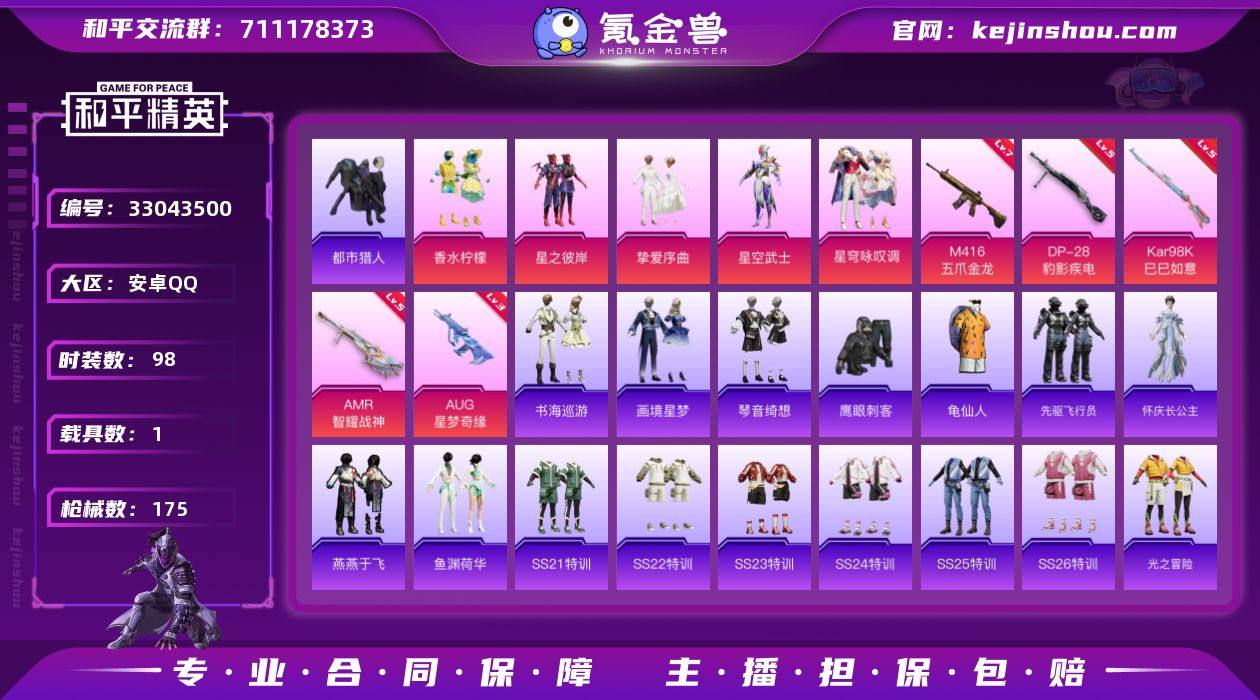 【AZH3332】安卓 手Q【二级艾丽娅 都市 星梦奇缘AUG 满级五爪金龙M416 1载具】1神装-5粉装-9特效枪-1载具-3粉色飞行器-53016热力值-4王牌印记-98套装-175枪皮 【红色神装等级】:暮色玫影-艾丽娅(二级) 【红色角色神装】:暮色玫影-艾丽娅 【热门品类】:套装-都市猎人,套装-龟仙人 【粉色套装】:粉装-香水柠檬,粉装-星之彼岸,粉装-挚爱序曲,角色-星空武士,粉装-星穹咏叹调 【粉色枪皮等级】:AKM-暮色玫影(三级),M416-五爪金龙(七级),AUG-星梦奇缘(三级),AKS-74U-森灵之息(五级),Kar98K-巳巳如意(五级),Mk14-福马献瑞(五级),AMR-智耀战神(五级),AA12-G-萌骑幻想(二级),DP-28-豹影疾电(五级) 【粉色载具】:暮色幽蹄 【粉色枪皮】:AKM-暮色玫影,M416-五爪金龙,AUG-星梦奇缘,AKS-74U-森灵之息,Kar98K-巳巳如意,Mk14-福马献瑞,AMR-智耀战神,AA12-G-萌骑幻想,DP-28-豹影疾电 【粉色飞行器】:沙丘之主天马,暮色之舞飞行器,踏卷乘风飞行器 【粉色降落伞】:银河战甲降落伞,至尊龙雀降落伞,甜蜜誓约降落伞,香水柠檬降落伞,蓝莓炮弹降落伞,纯梦嫁纱降落伞,飒粉甜心降落伞,天星战神降落伞,未来歌姬降落伞,莲影清波降落伞,星梦奇缘降落伞,千金淑...