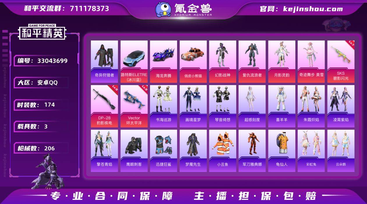 【AZH3381】安卓 手Q【幻影战神美雪小丑鱼 满级碧影闪光SKS 3载具】4粉装-4特效枪-3载具-2粉色飞行器-66416热力值-8王牌印记-174套装-206枪皮 【热门品类】:套装-小丑鱼,套装-奇异狩猎者,角色-军刀雅典娜,套装-龟仙人 【粉色套装】:粉装-幻影战神,角色-复仇流浪者,角色-月影灵韵,角色-奇迹舞步 美雪 【粉色枪皮等级】:Vector-环太平洋(五级),SKS-碧影闪光(七级),Mk14-福马献瑞(五级),DP-28-豹影疾电(五级) 【粉色载具】:路特斯ELETRE(冰川蓝),海龙奔腾,俏皮小熊猫 【粉色枪皮】:Vector-环太平洋,SKS-碧影闪光,Mk14-福马献瑞,DP-28-豹影疾电 【粉色飞行器】:炫彩糖果飞行器,极意拳锋飞行器 【粉色降落伞】:绝对恒星降落伞,幻影战神降落伞,繁花小夜曲降落伞,银刃赛罗降落伞,星之彼岸降落伞,庄周梦蝶降落伞,环太平洋降落伞,暗夜鎏金降落伞,圣堂之誓降落伞,星穹咏叹调降落伞,绯穹魔姬降落伞,炫彩糖果降落伞,鸢尾珑雾降落伞 【稀有套装】:套装-龟仙人,角色-超感刻度,套装-雪国风尚,套装-炫彩糖果,套装-马上有钱,套装-彩虹兔,套装-云朵鹅,套装-雪绒豹,套装-蜜露汐语,角色-绛羽幽主,角色-夜瞳黯灵,套装-朱霞炽焰,套装-凌霄紫焰,套...